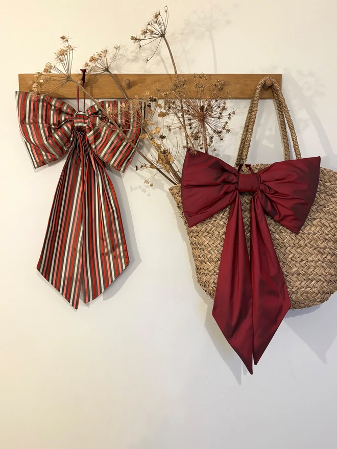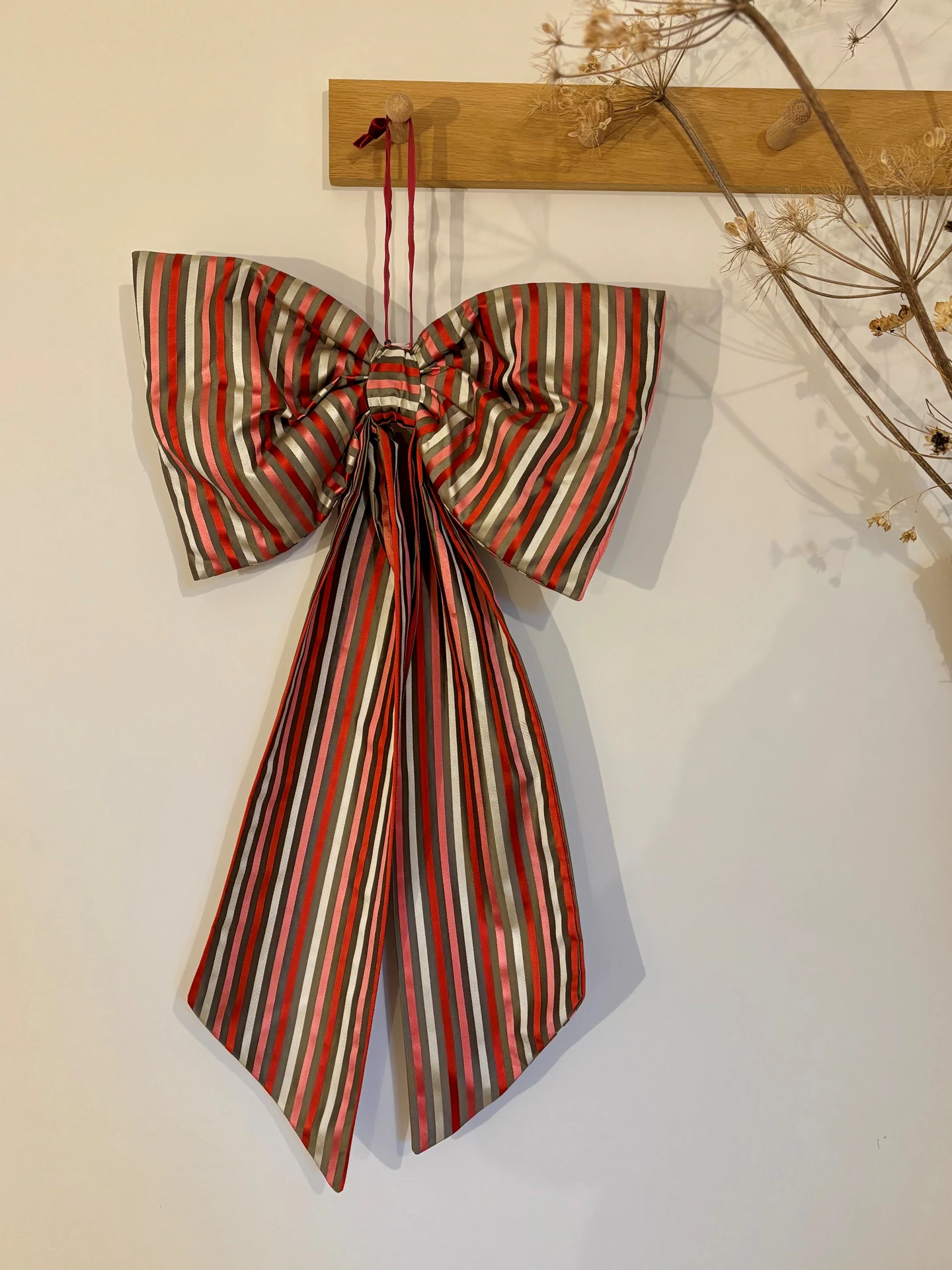 A beautiful oversized bow handmade from a gorgeously luxurious stripe silk fabric. Taupe, red, pink and beige candy stripe - ticking all your Christmas boxes!...