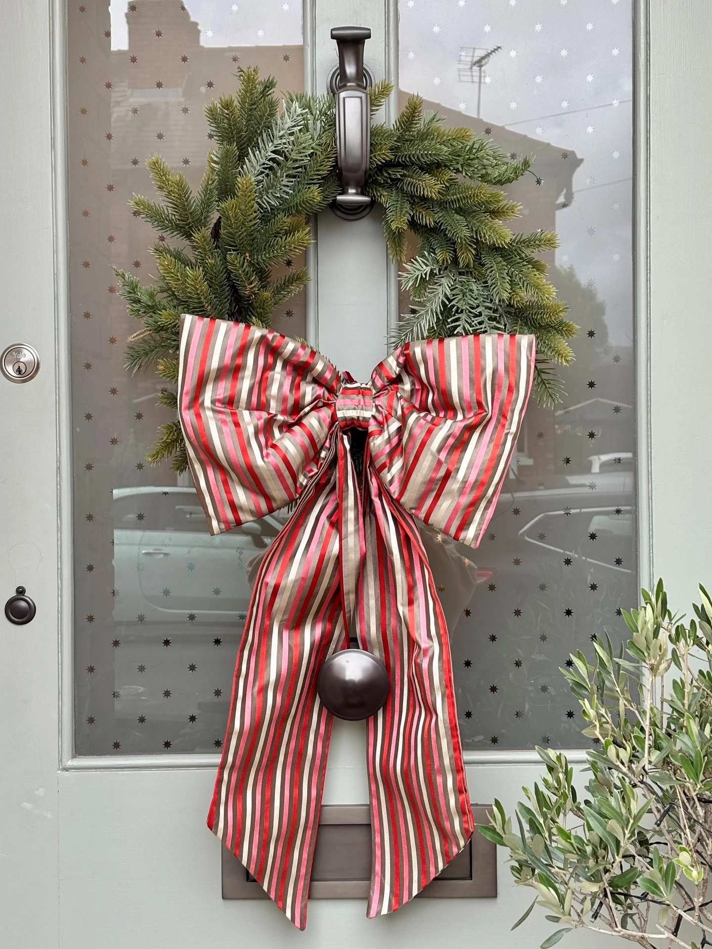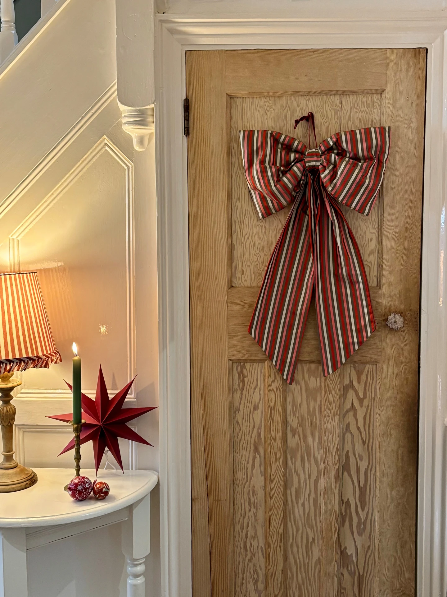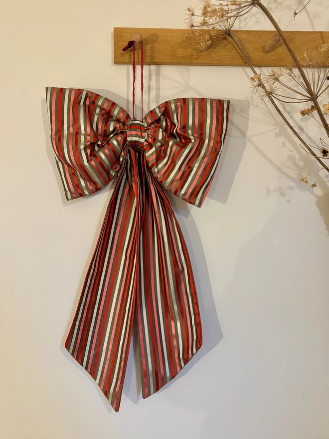 A beautiful oversized bow handmade from a gorgeously luxurious stripe silk fabric. Taupe, red, pink and beige candy stripe - ticking all your Christmas boxes!