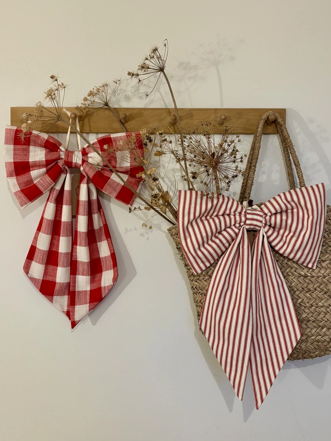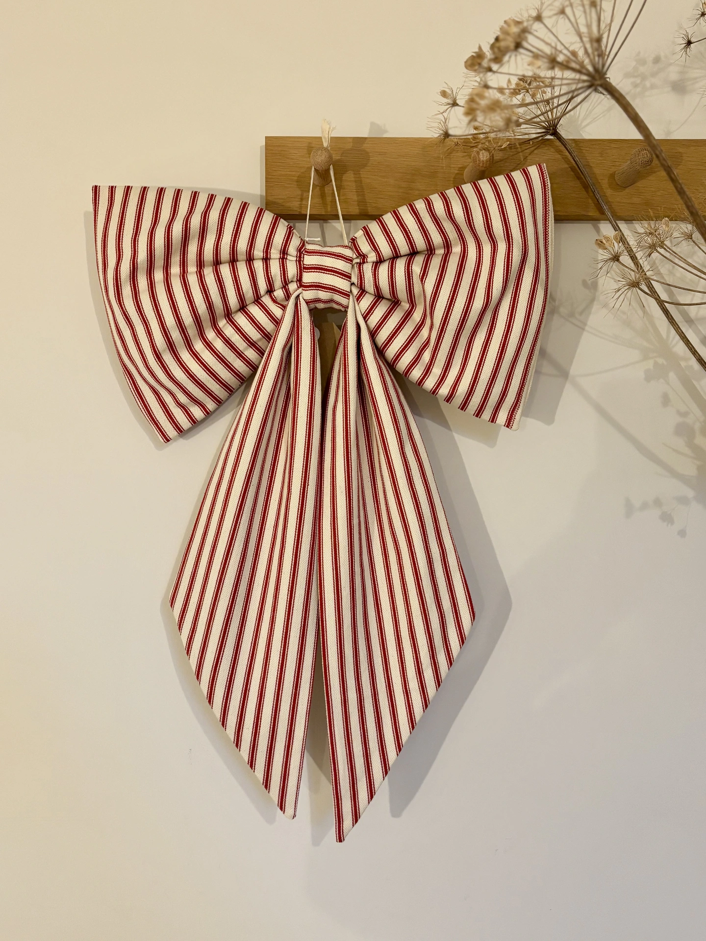 A beautiful oversized bow handmade from a classic red and white ticking stripe cotton fabric.