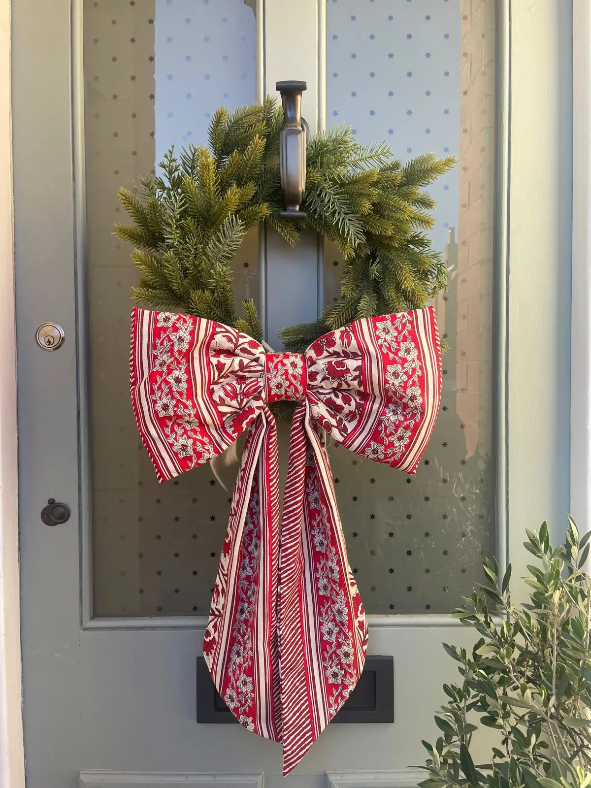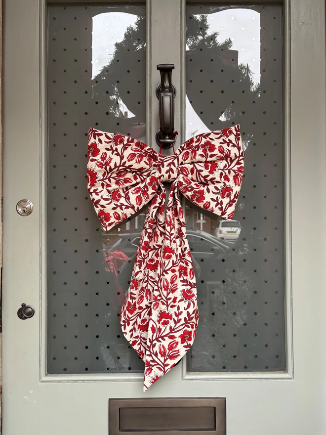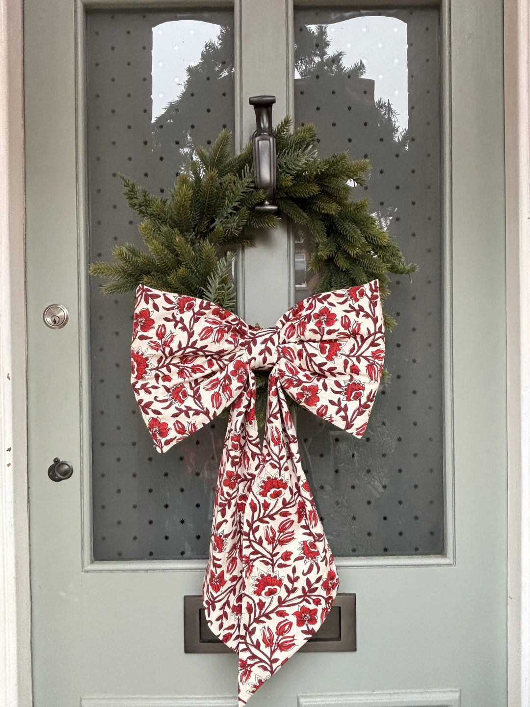 A beautiful oversized bow handmade from a beautiful red and ivory block print design fabric.
