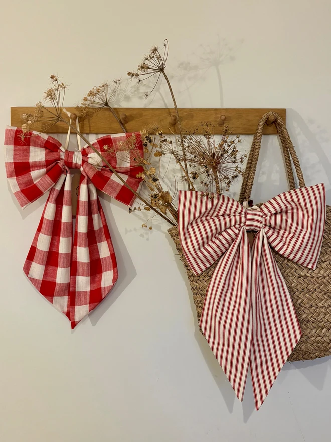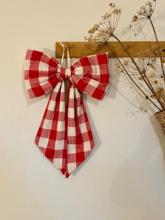 A beautiful oversized bow handmade from a gorgeous vibrant red and white gingham check linen blend fabric.