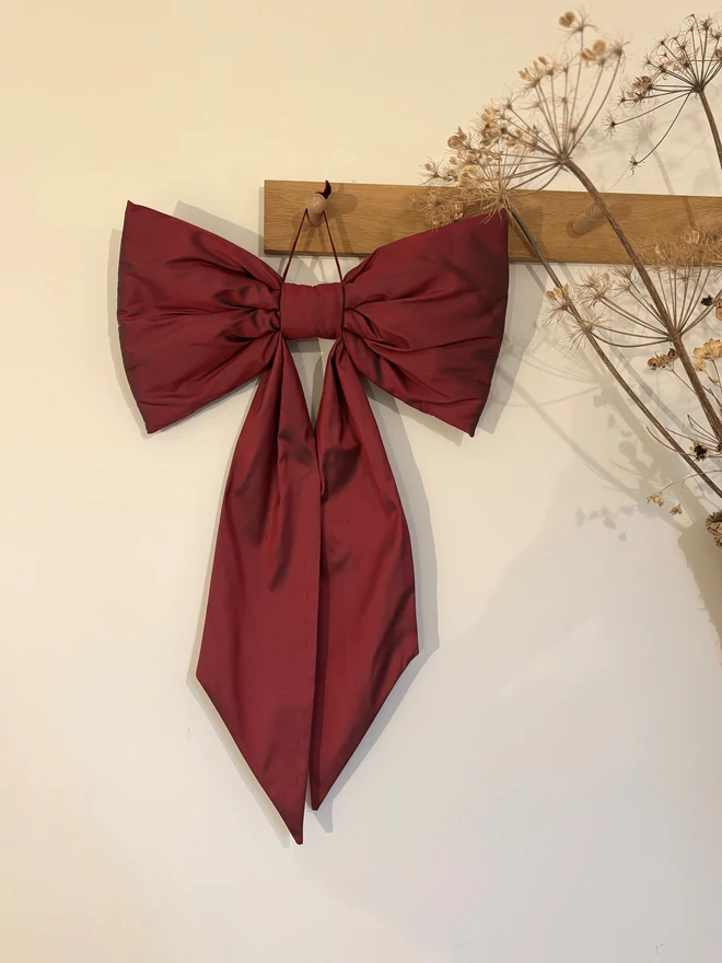 A beautiful oversized bow handmade from a stunning deep red shot silk, which has glimmers of dark green when it catches the light.