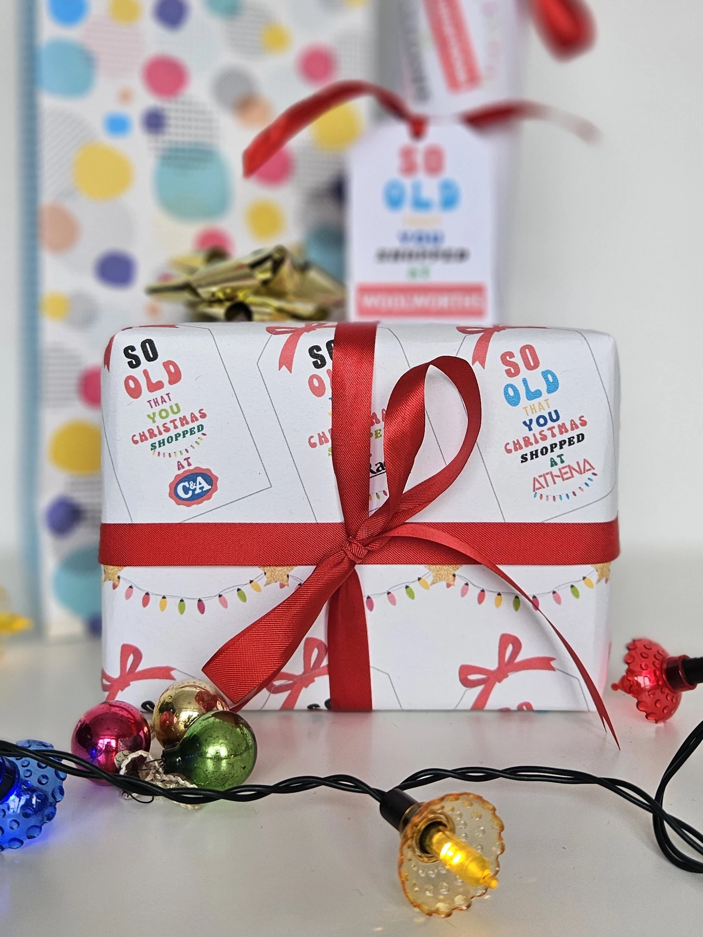 Shops illustrated in the wrapping paper design include Woolworths, C&A, Athena, Sock Shop, and Tie Rack