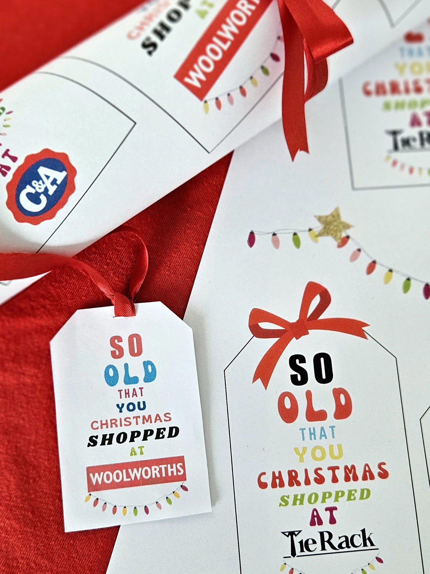 Shops featured in the wrapping paper design are Woolworths, C&A, Athena, Sock Shop, and Tie Rack.