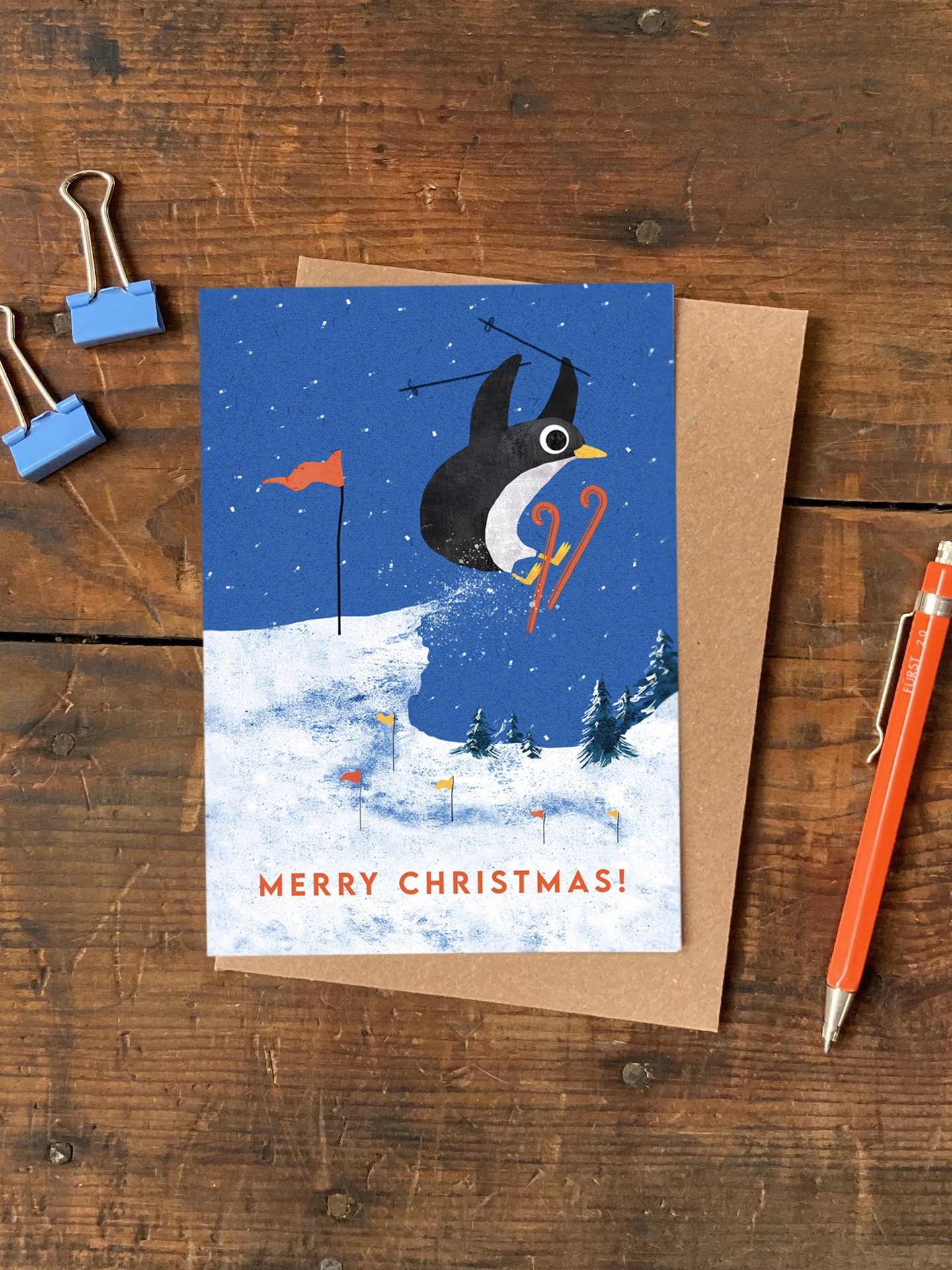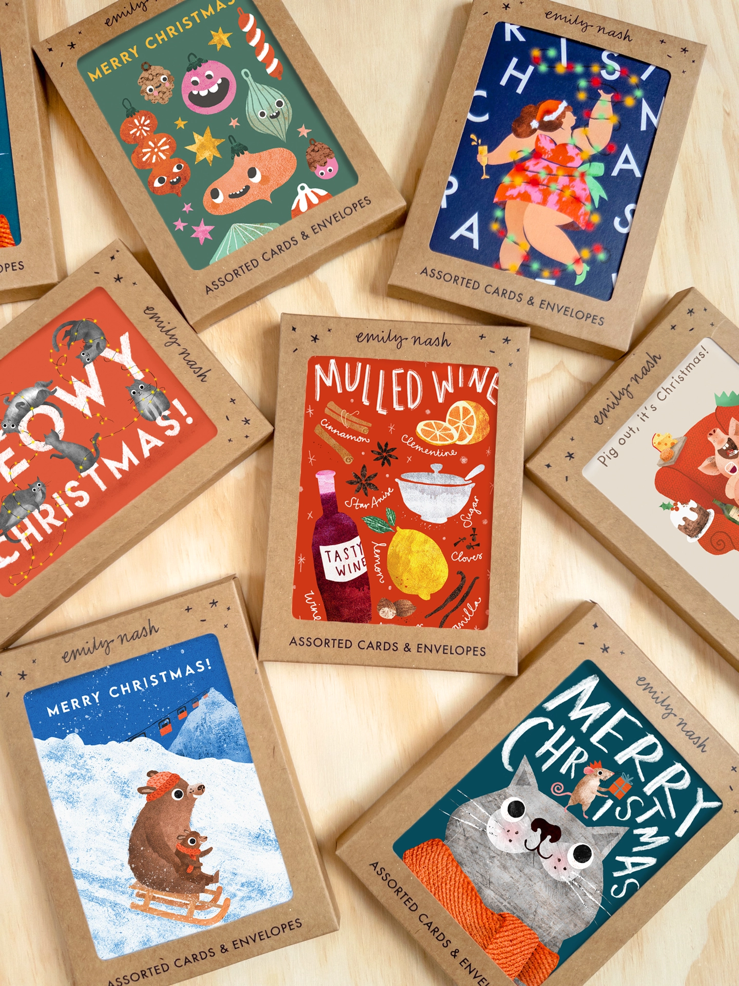 A bright and vibrant assorted pack of 8 illustrated Christmas cards by Emily Nash. This playful holiday multipack includes four assorted animal designs; bear, penguin, fox and rabbit, all having a magical time on the slopes!...