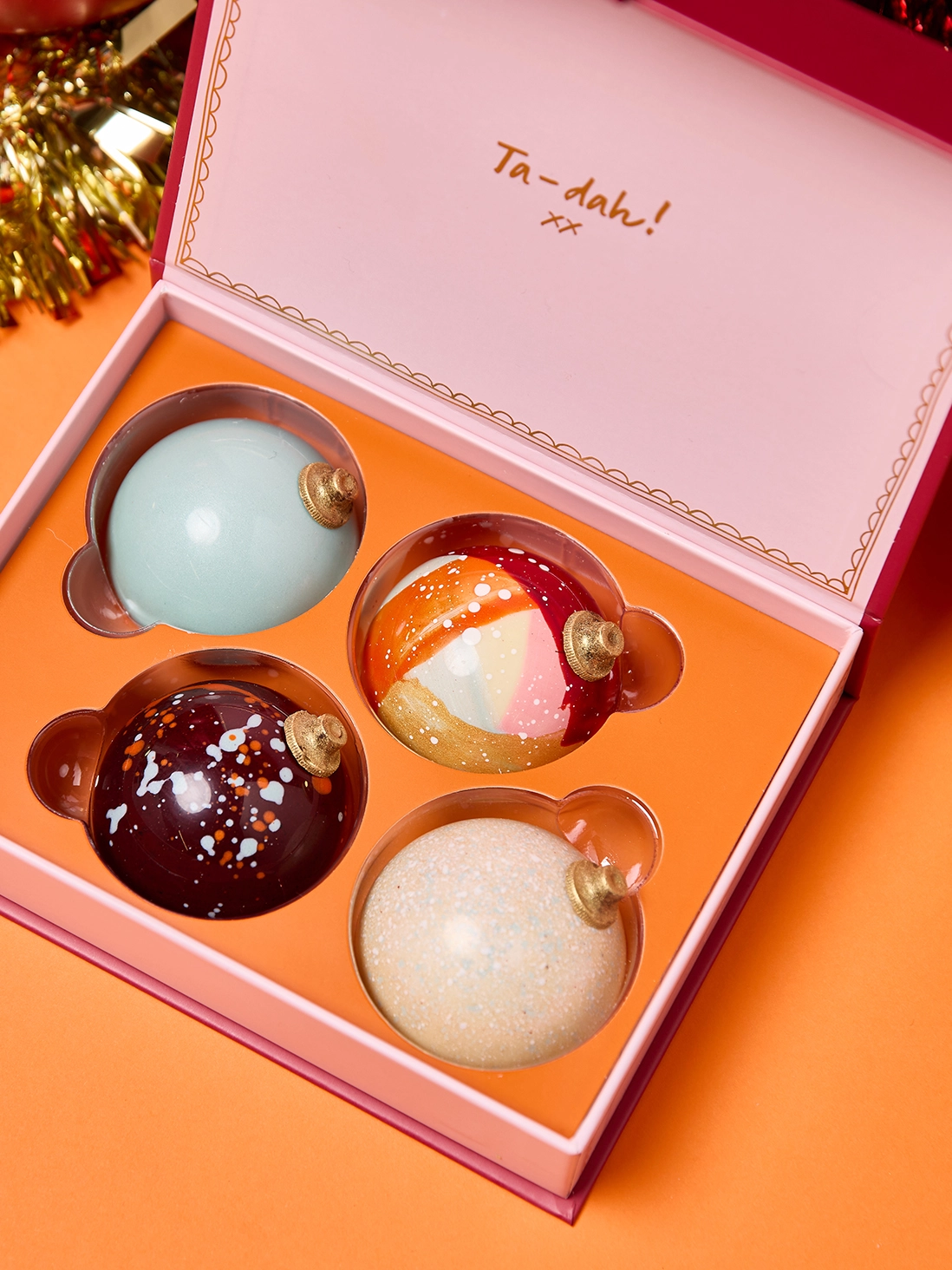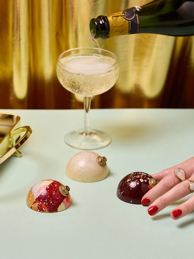 Champagne Bellini bauble : light, effervescent champagne fluff folded with blood orange curd and finished in glossy chocolate.