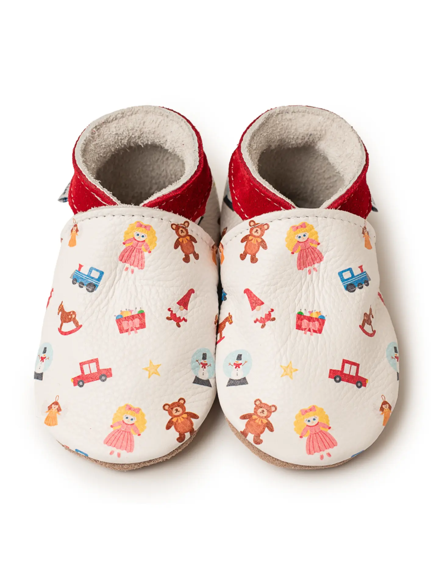 These white leather baby shoes offer a distinctive design for the festive season. They feature an array of classic toy prints, including a detailed doll, a teddy bear, a miniature train, a rocking horse, a car, and a delicate snow globe. This collection of festive imagery makes them a fitting gift choice for Christmas. Made from soft leather, these shoes are designed for comfort and ease of wear for little feet.