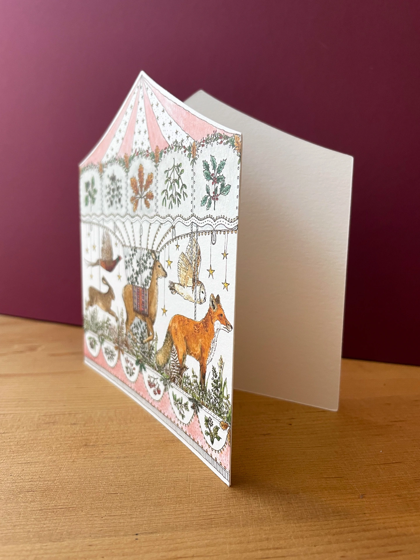 This wintry card is inspired by the woodland surrounding me in South Wales, full of drying ferns and dropped acorns. The card is cut to the shape of the carousel, and is blank inside.
