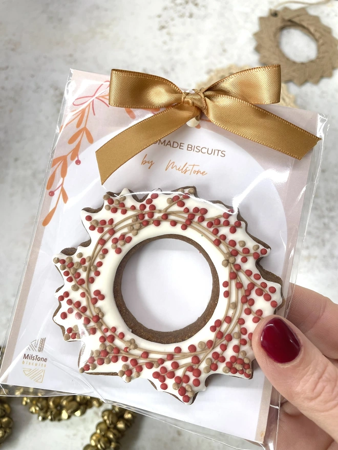 Every biscuit comes individually wrapped, finished with a luxury ribbon bow, and mounted on a seasonal backing card — ready to gift straight away.