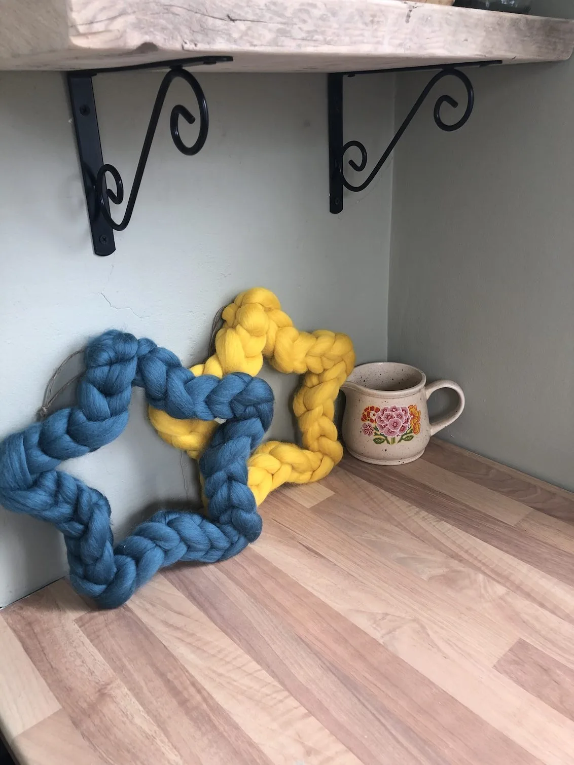 Handmade mini chunky merino woollen star wreath measures Approx 12" in size.