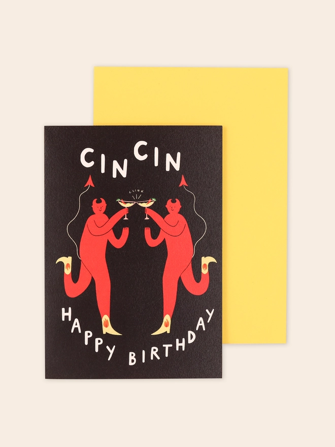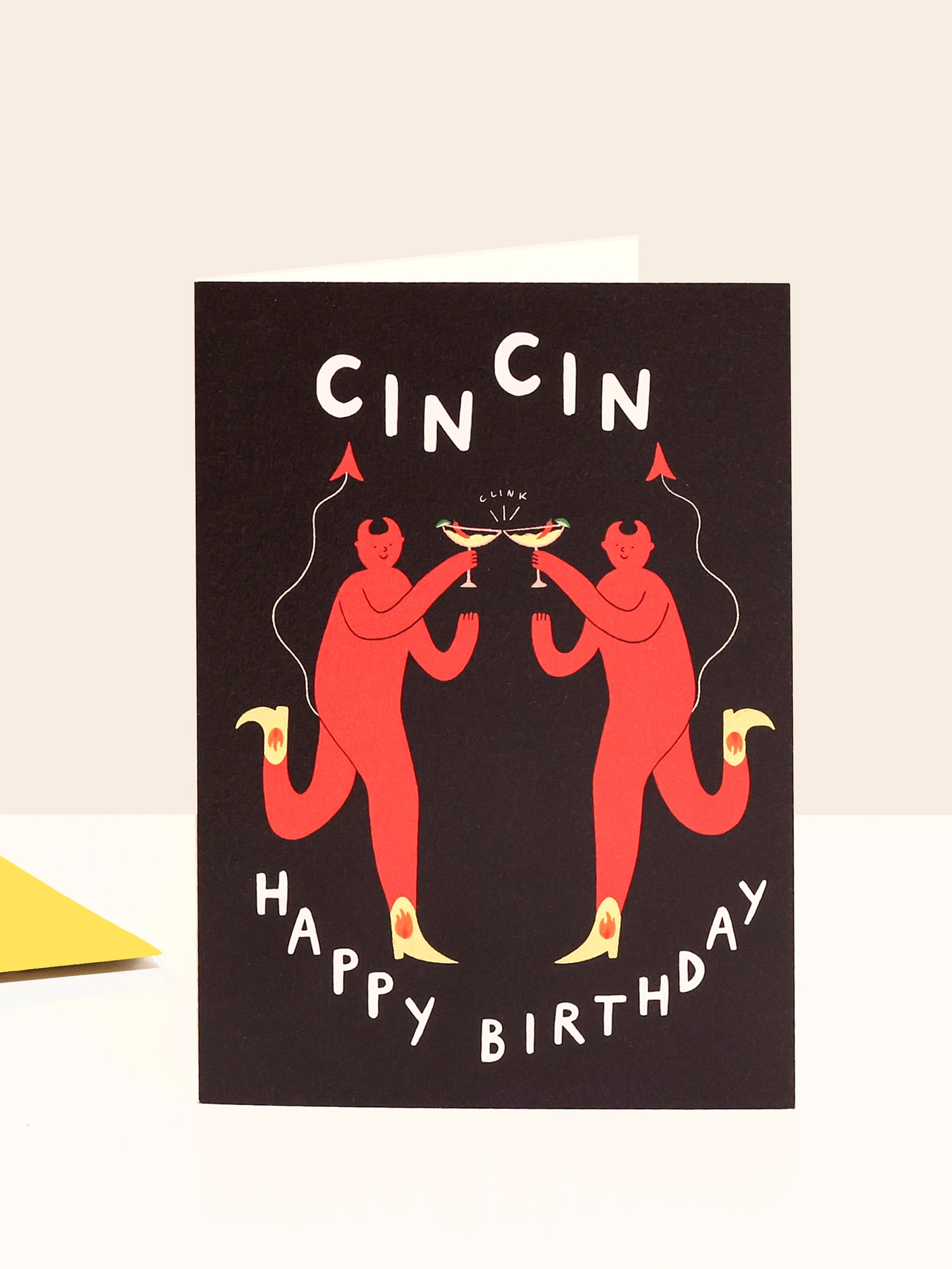 Contemporary cocktail card featuring two cheeky devils toasting spicy margaritas. Playful type reads 'Cin Cin Happy Birthday'.