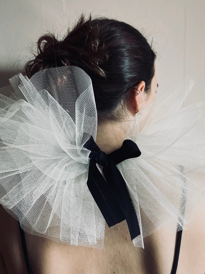 For a simple clown costume wear this tulle collar with a stripe tee, a cone hat and some clown makeup.