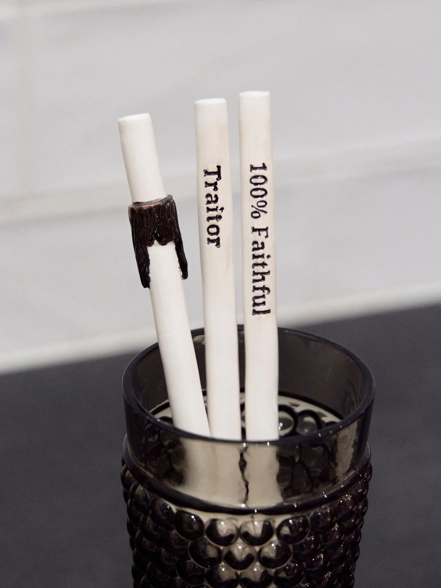 The set includes two stark text straws — “Traitor” and “100% Faithful” — alongside a sculptural centre straw featuring a dark ceramic fringe motif wrapped around the form. Designed to feel slightly theatrical, a little ominous, and entirely knowing.