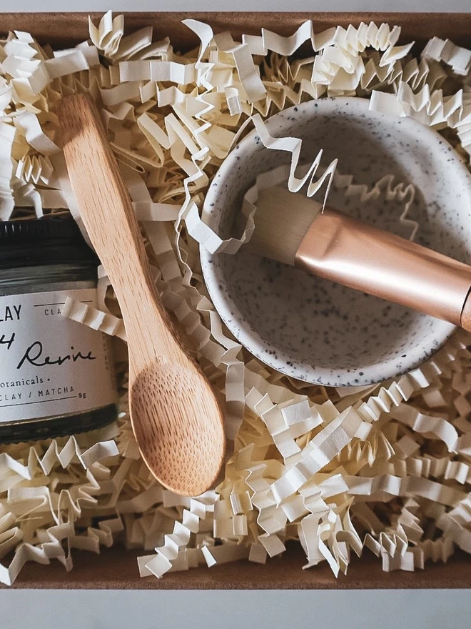 Our bestselling face mask jars alongside a little recycled melamine/coffee waste bowl and spoon for mixing. Comes with 2 x round reusable bamboo cleansing cloths and a little facial brush for applying the mask. There are approximately 5 applications per jar.