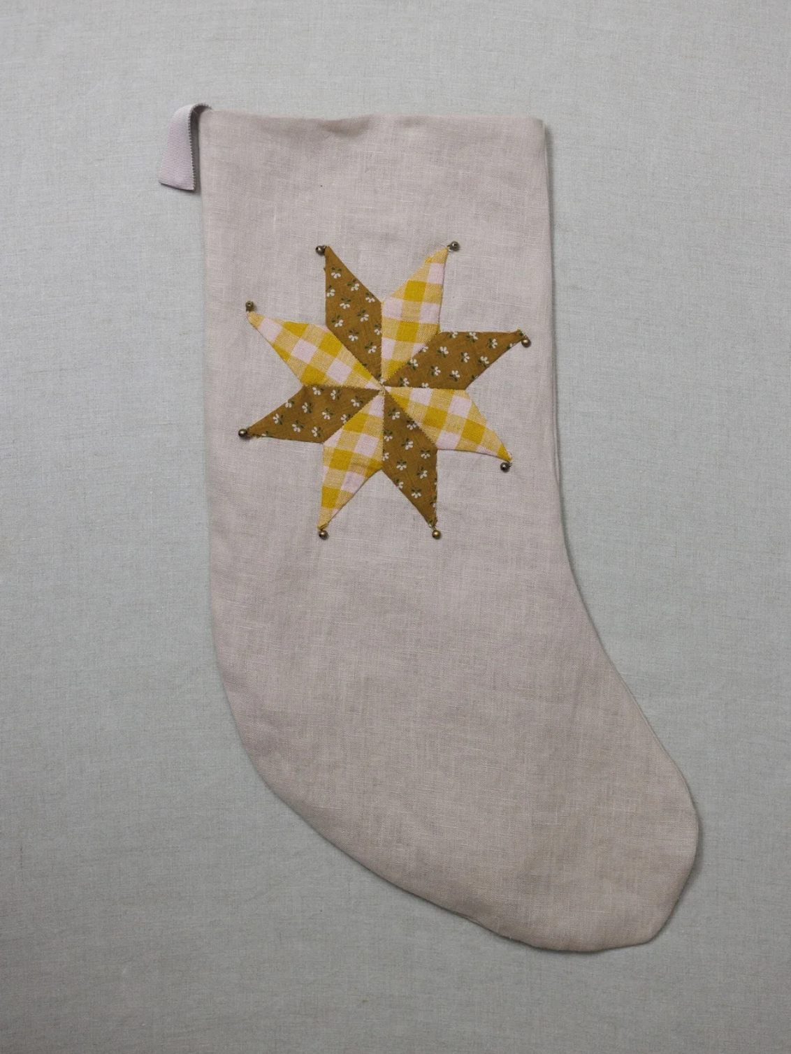 Crafted by hand in linen and and lined with Liberty Tana Lawn cotton, this limited edition handmade patchwork stocking is appliqued with a star that’s embellished with tiny bronzed tinkling bells at the points.