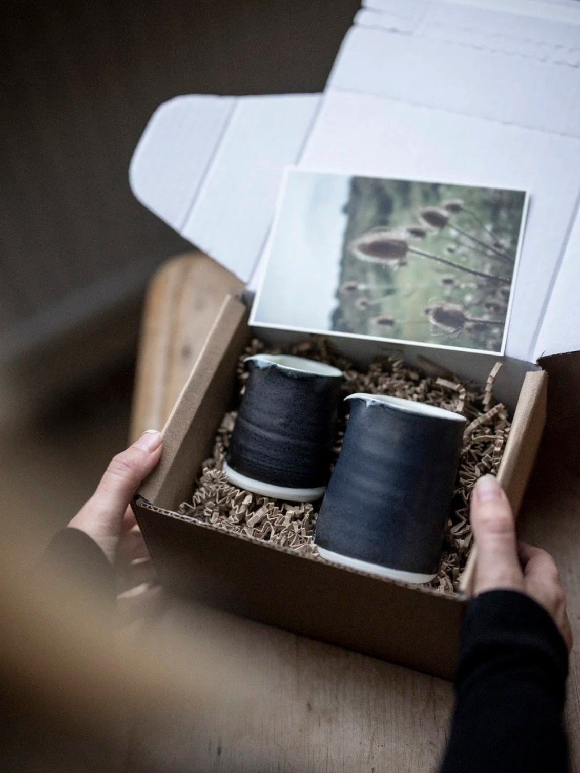 We like to use one of them on a tray with our morning coffee by the fire, and they often make an appearance on our dining table when we’re serving tea for friends, bringing a little touch of elegance to proceedings. The pleasing contrast between the matt black glaze and the smooth, slightly gloss interior white is a thing of quiet beauty.