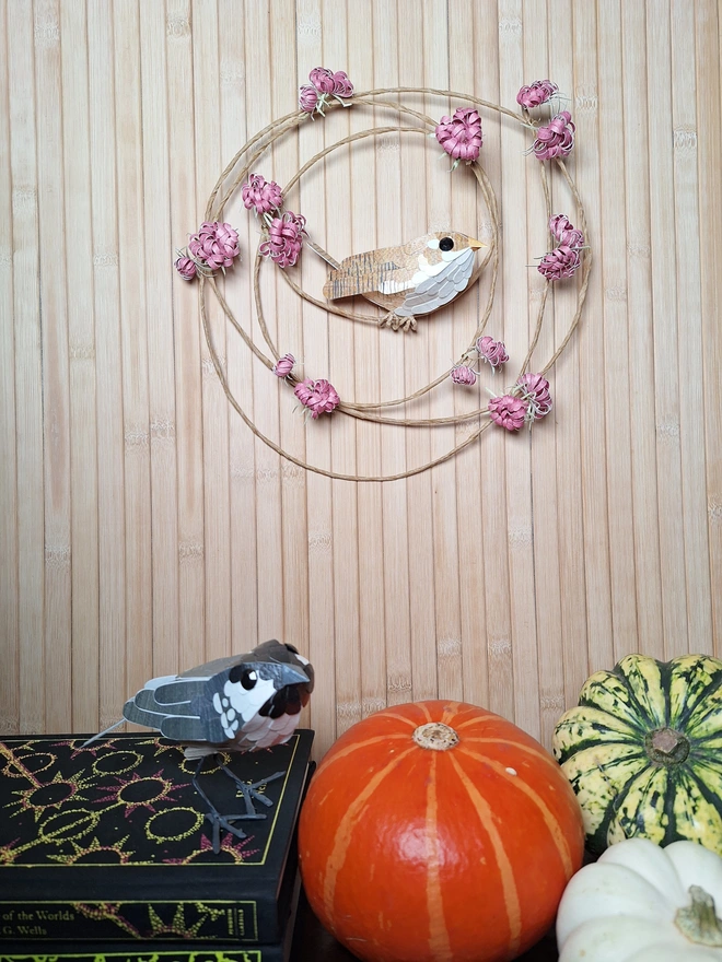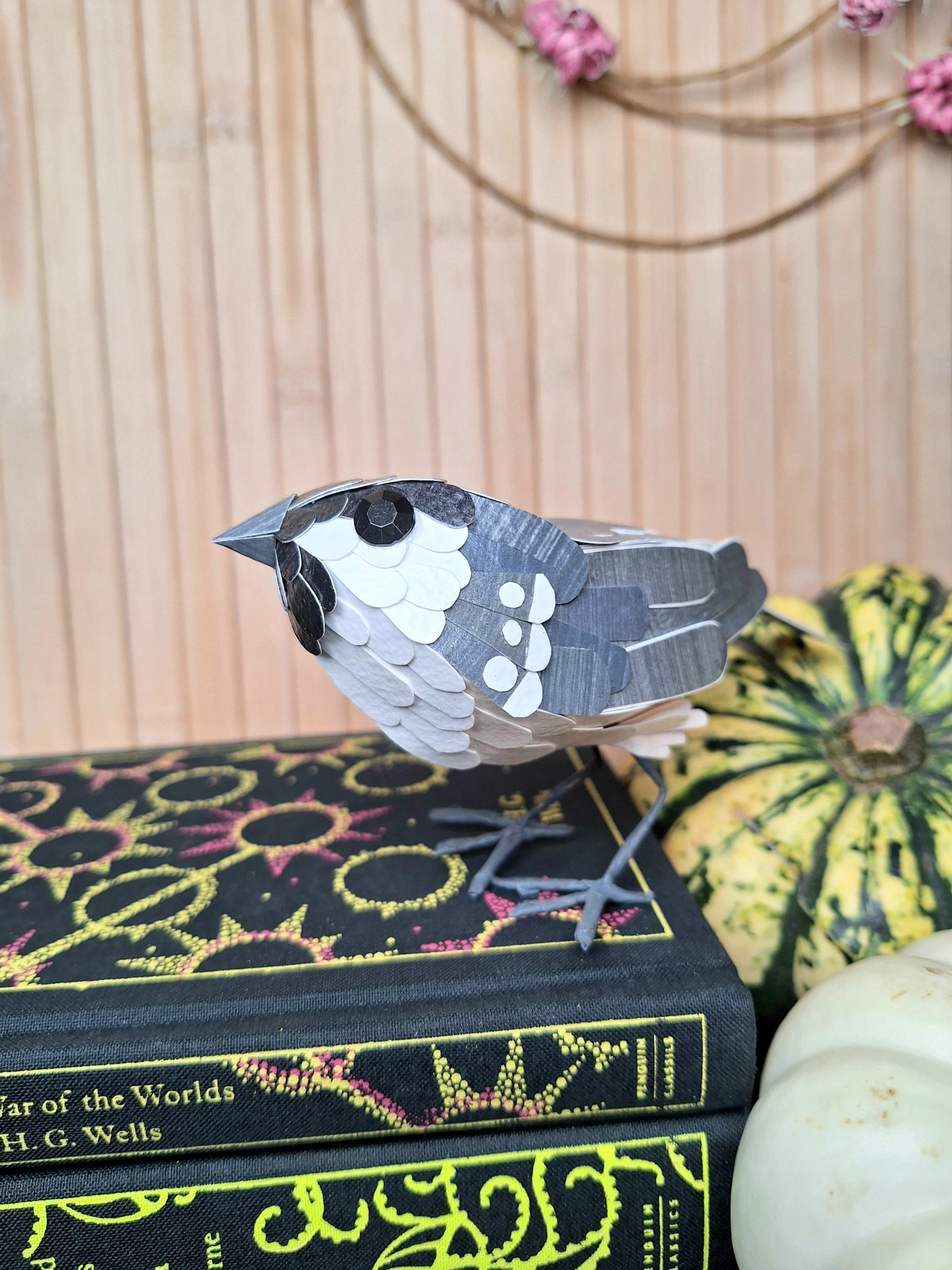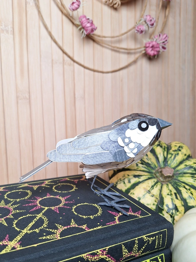 This handmade paper sculpture coal tot is made from hand printed papers in grey, black and white. He's a lovely monochrome bird with polka dot details on his shoulders. He is covered in hand cut feathers made from hand printed papers and stands on steel wire feet. The cardstock is layers and layers of a robust 300 GSM recycled card, which makes him very sturdy. He is varnished with a satin finish lacquer.