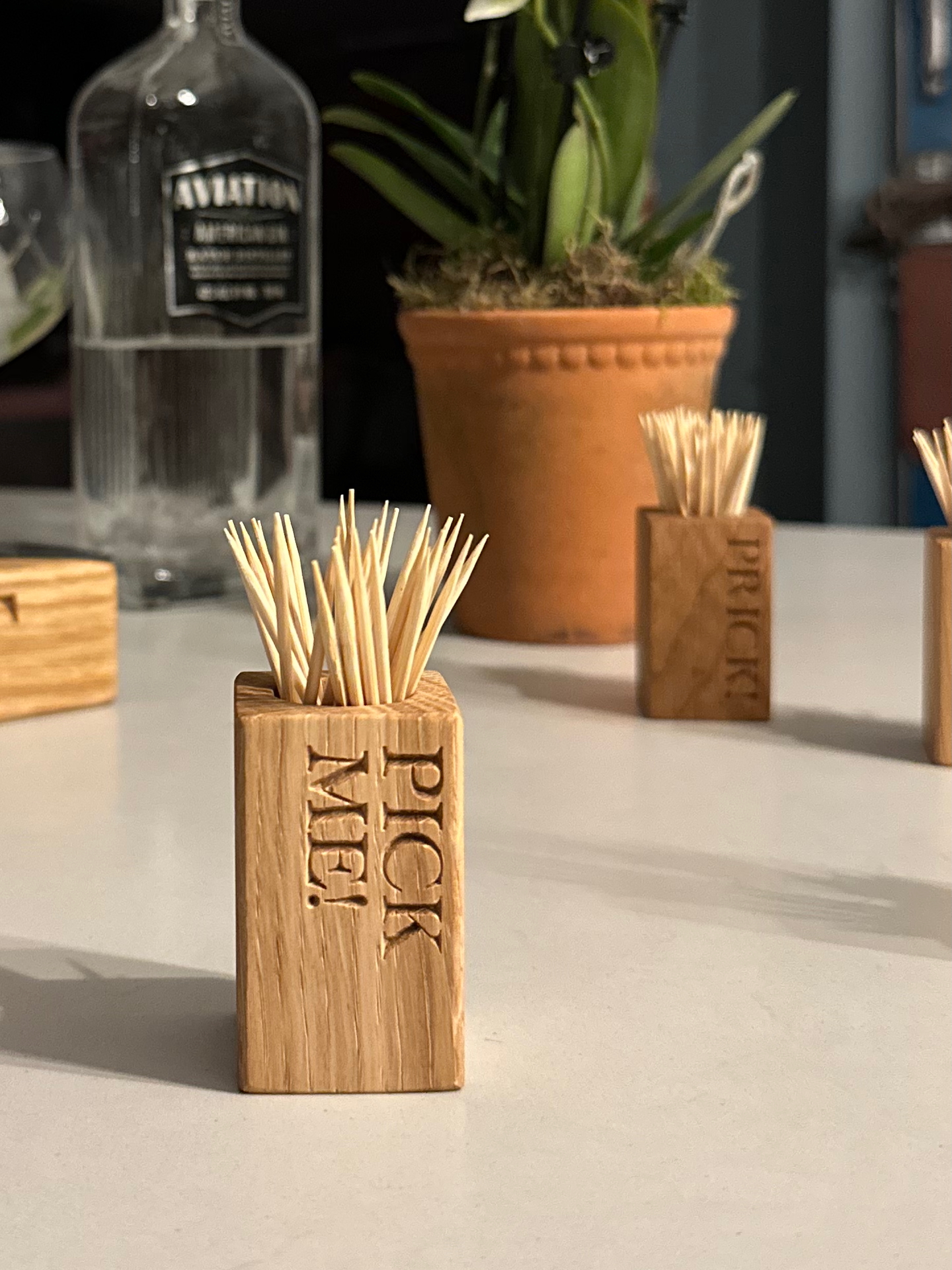 An often overlooked and even forgotten little detail at any gathering. This little solid oak cocktail stick cup won’t go unnoticed! It might even become an icebreaker or talking point!