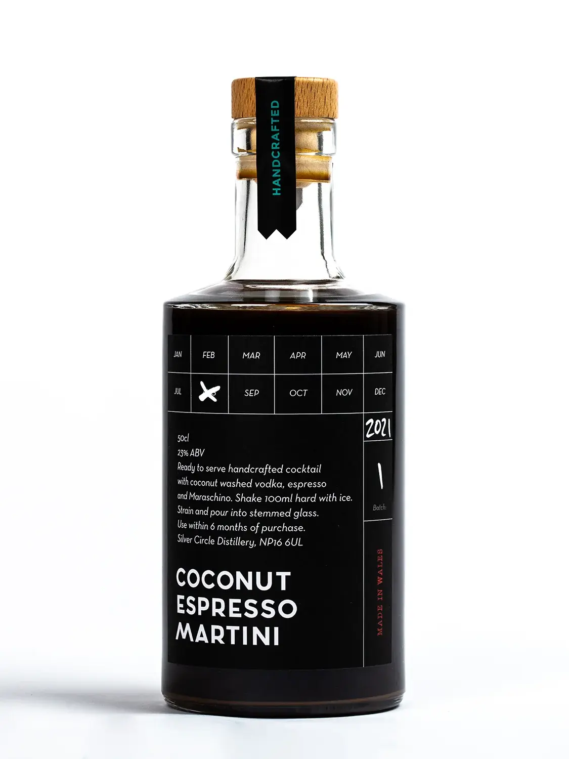 A warming cocktail with deep, fruity notes made with coconut washed vodka, espresso and maraschino. Shake hard with ice, strain and pour into a stemmed glass.