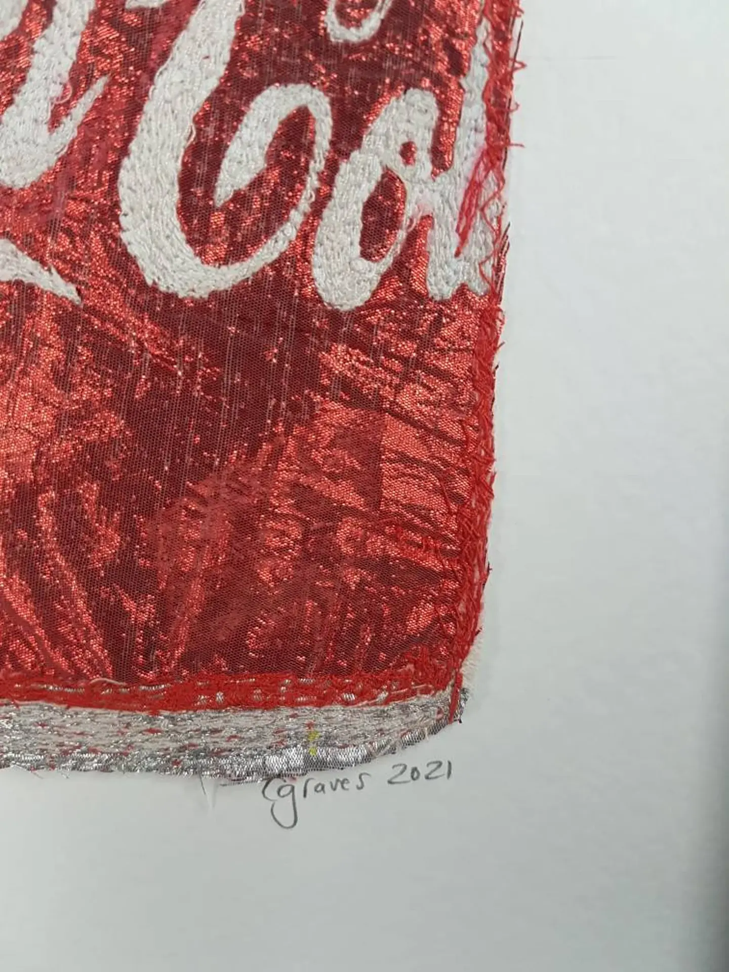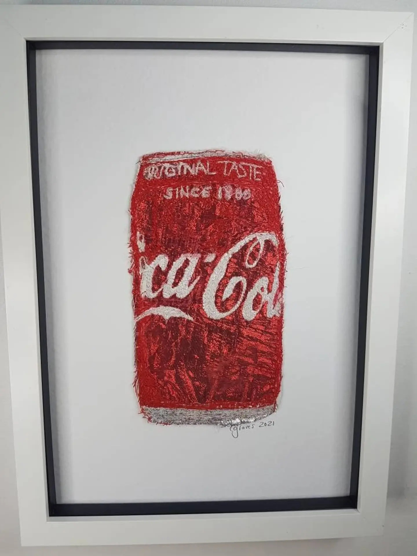 ”This is my Full fat ! Coke Can machine embroidery which I love to drink!! It is made using metallic red lame metallic fabric and free motion embroidery. I made the can pull using silver metallic fabric which is 3D. I love Full fat coke so much ....!!