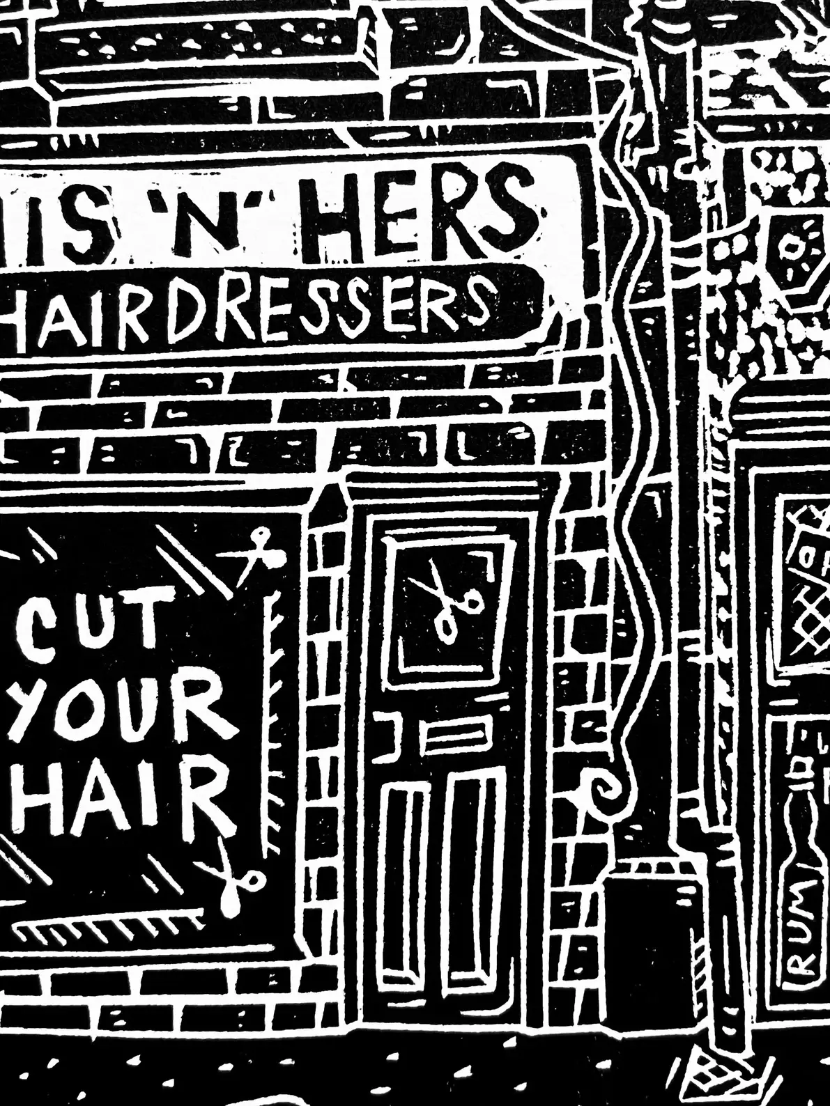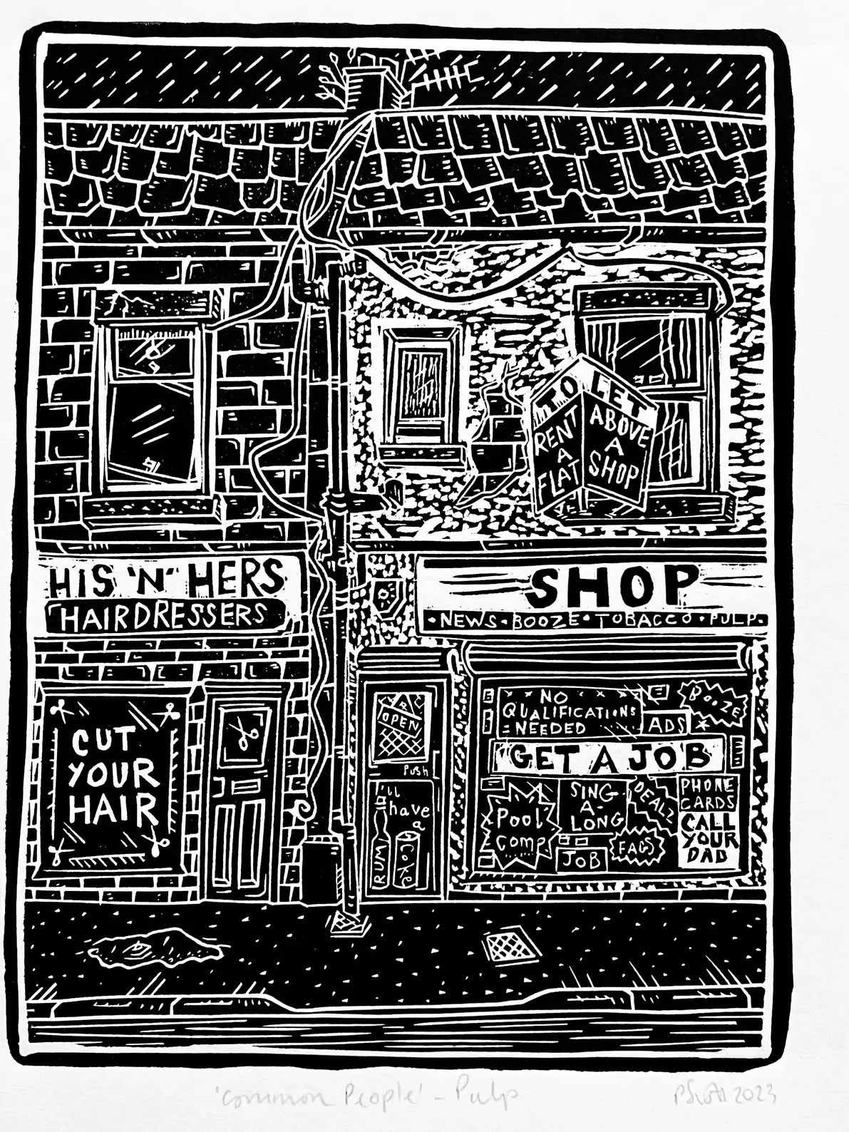 Original linocut print inspired by lyrics from the song 'Common People' by Pulp, from their album 'Different Class' from 1995.