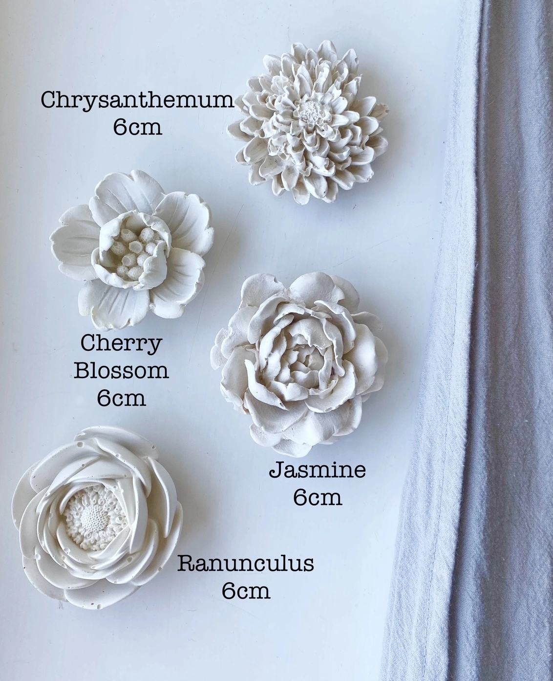 Larger Carnation flower size: 9cm width by 3cm depth. Ranunculus flower: 5cm width by 3cm depth. Poppy: 5cm width by 2m depth. Lotus Flower: 9cm width by 4.5cm depth.