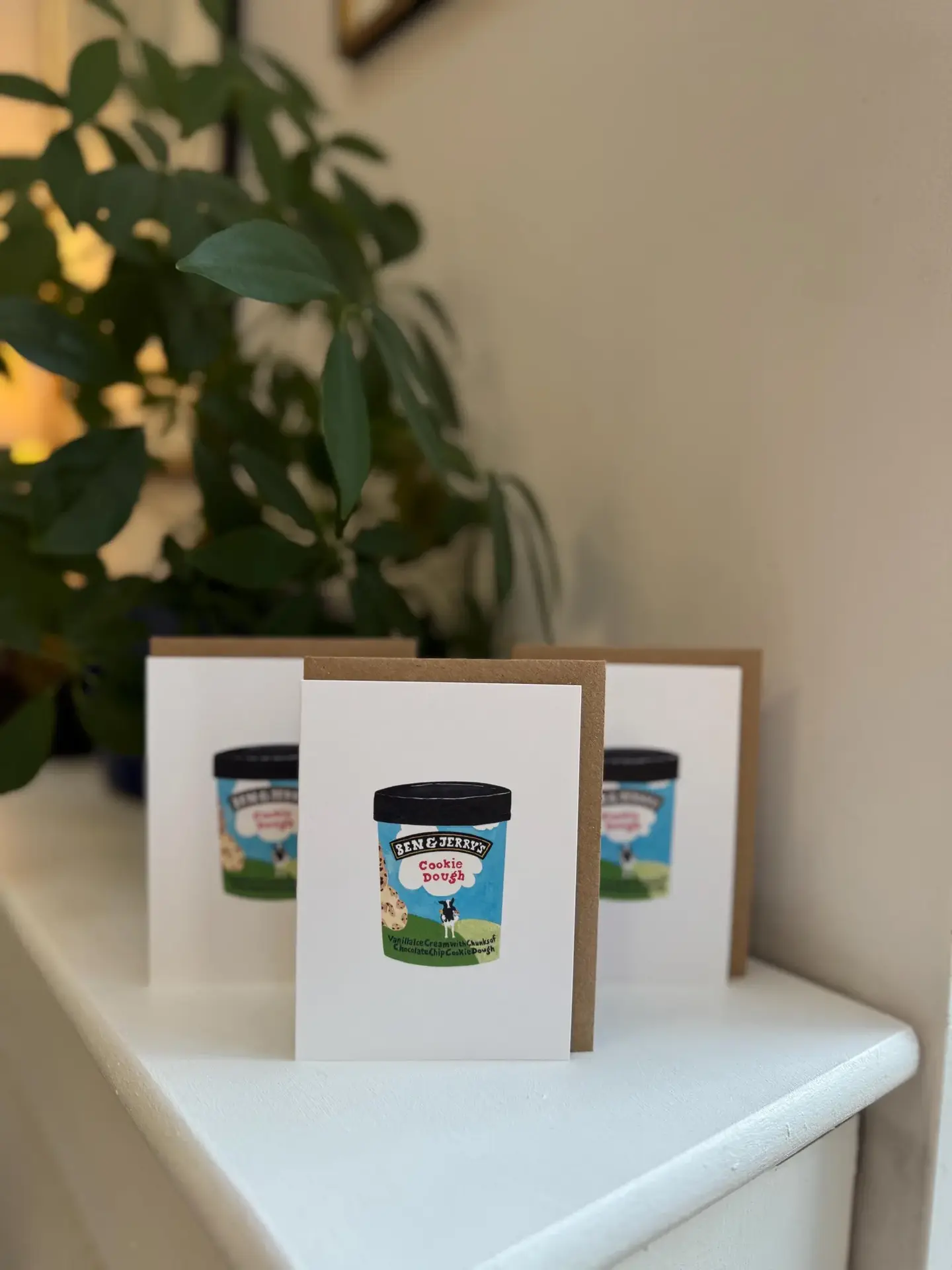 Pack of 3 cookie dough ice cream tub watercolour mini cards. Hand painted by me and professionally printed on delicately textured matte white 324 gsm luxury print paper.