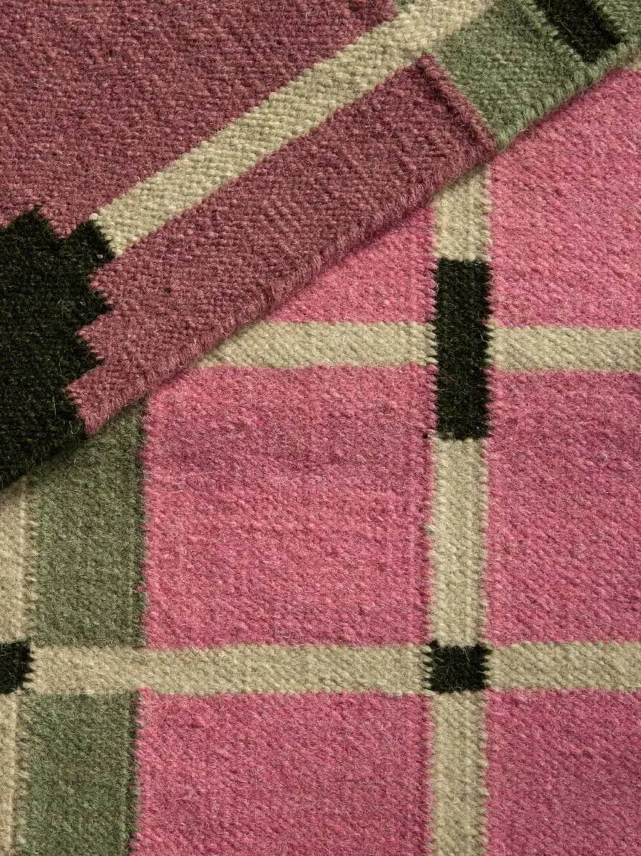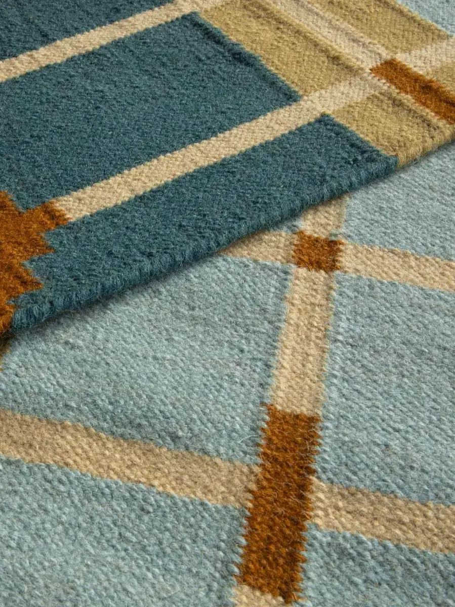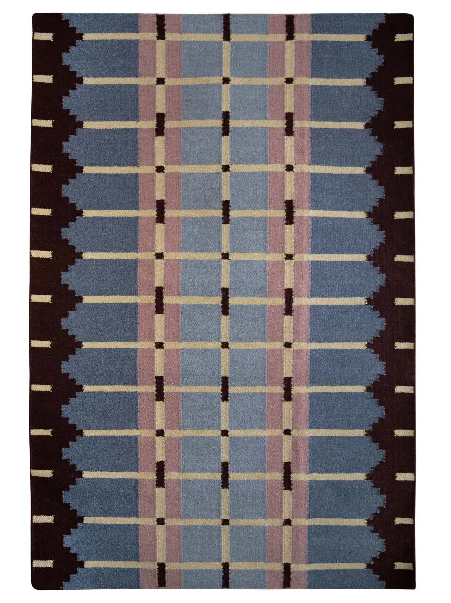 A flatweave rug, handwoven with an architectural grid pattern...