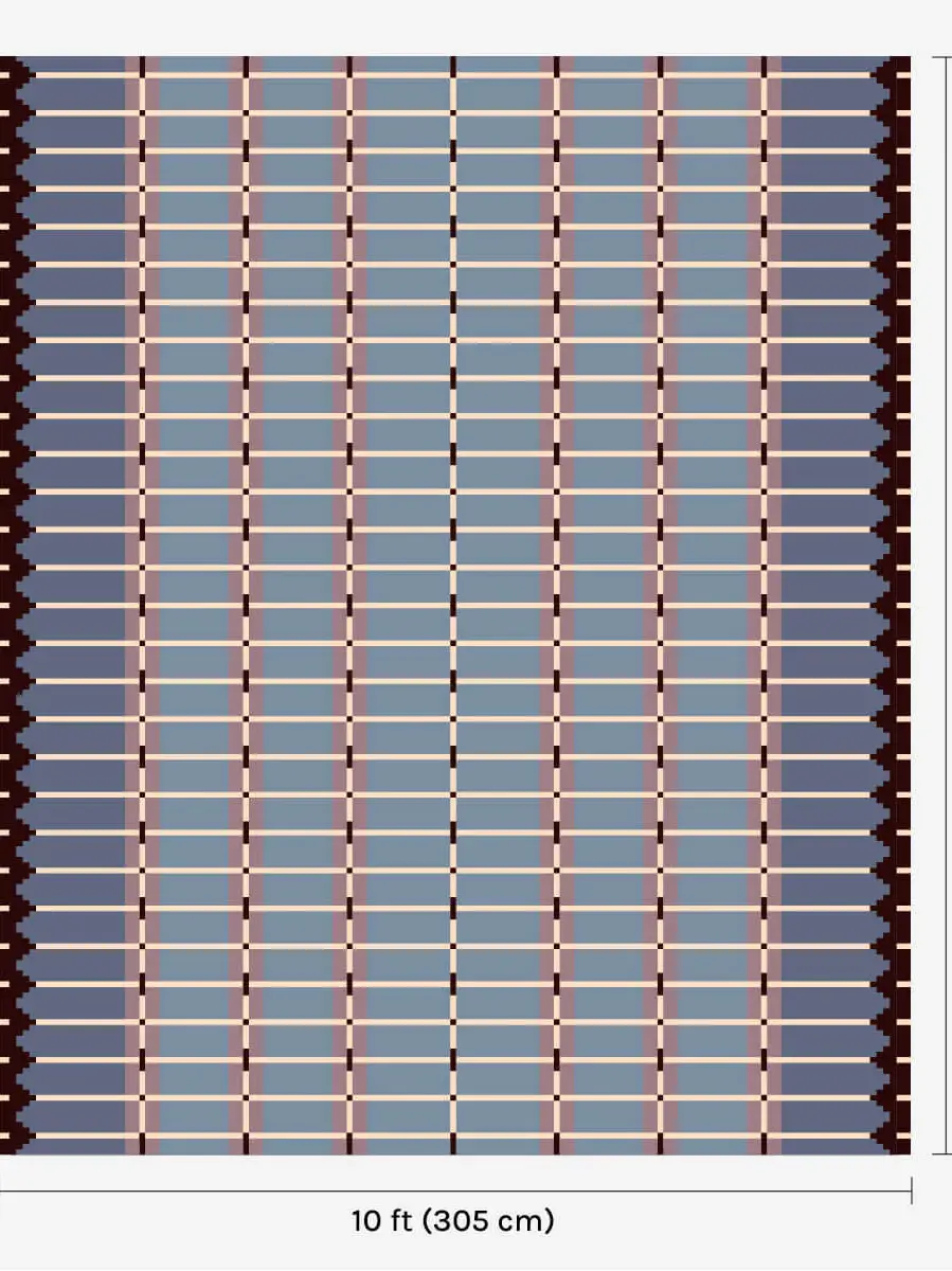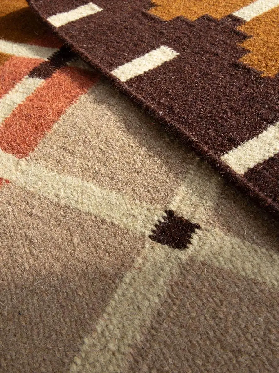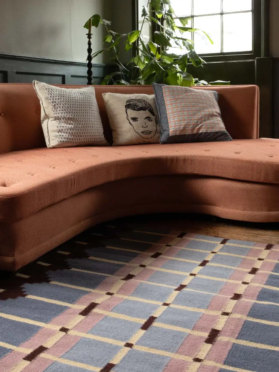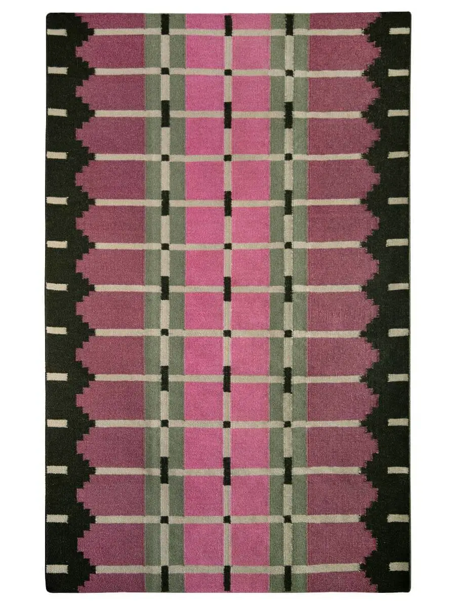A flatweave rug, handwoven with an architectural grid pattern.