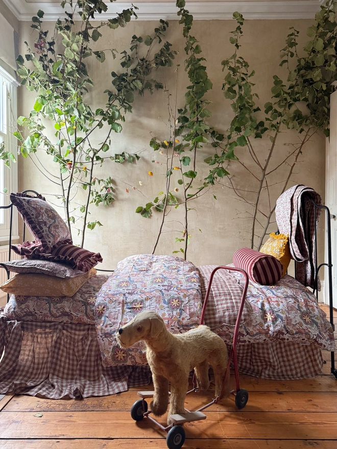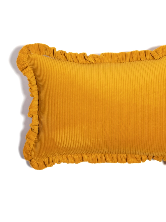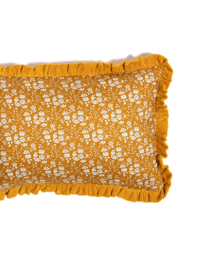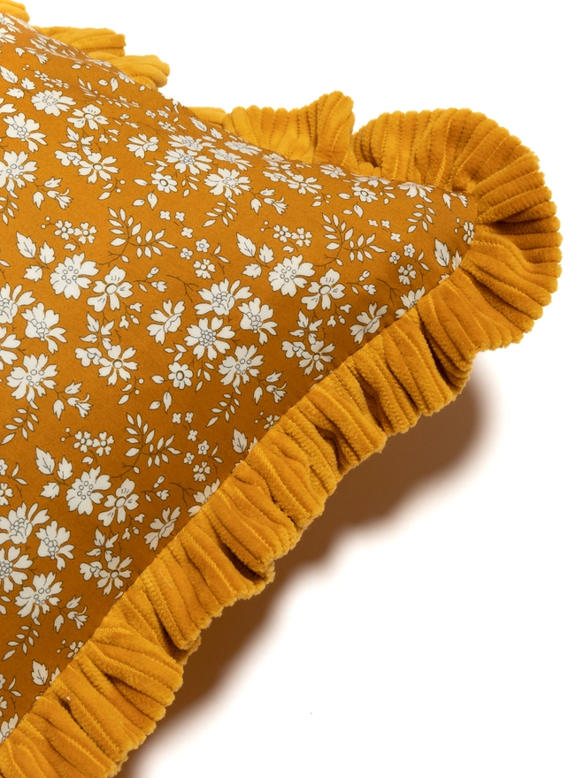 This scrumptious cushion is handmade from cotton cord and Liberty of London fabric ‘Capel’. Finished with a small ruffle along all edges, this vibrant cushion will add a playful touch to any room.