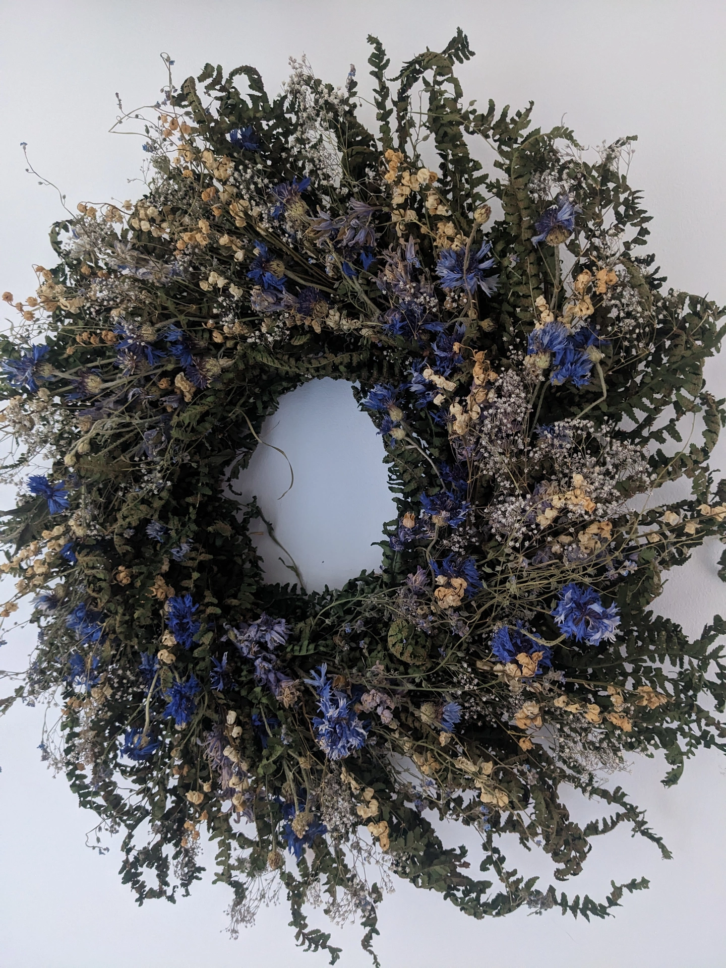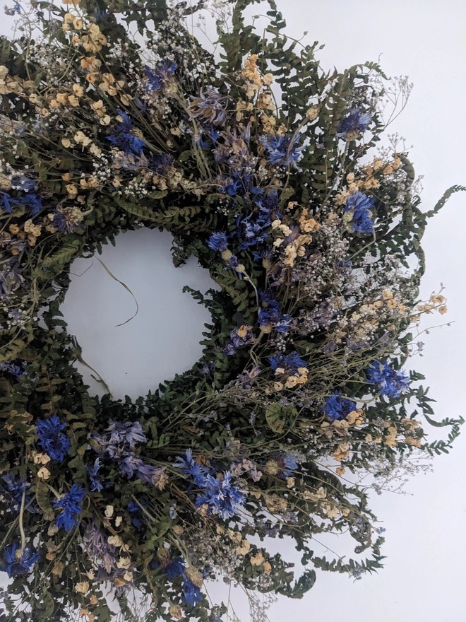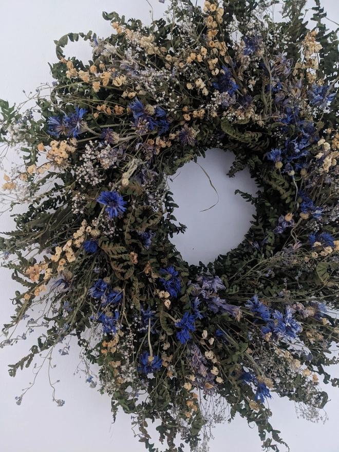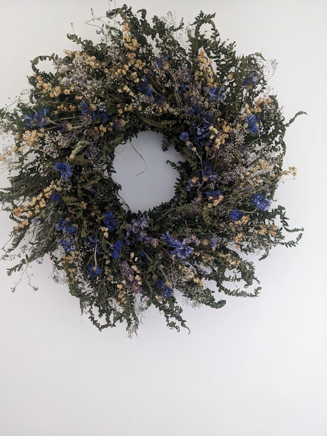 This 45cm handmade wreath is crafted from organically grown, air-dried cornflowers, lily of the valley, gypsofilia and touch of forget-me-nots in soft pale blue and white hues. Delicate, timeless, and full of natural charm, it’s a beautiful way to bring a touch of the garden indoors.