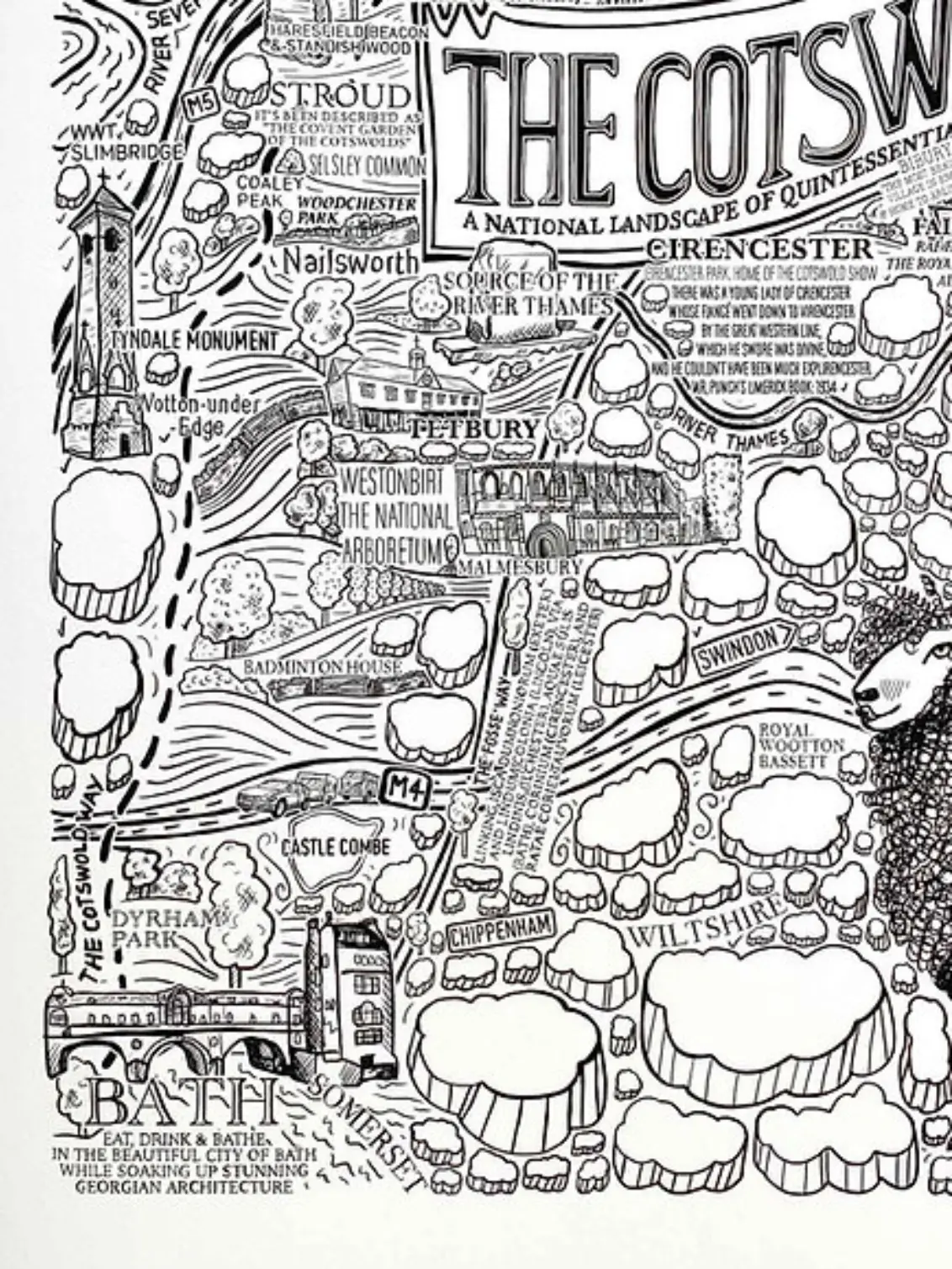 Carefully researched and hand-drawn by me, James, this Cotswolds illustration is filled with quirky details and fascinating touches that make my work truly distinctive. From Broadway Tower to Bath, and Cheltenham to Charlbury, this print captures the unique spirit of the region. Stretching across nearly 800 square miles and five counties — Gloucestershire, Oxfordshire, Warwickshire, Wiltshire, and Worcestershire — the Cotswolds is defined by its golden-hued stone buildings, rolling hills, and picturesque “wolds.”