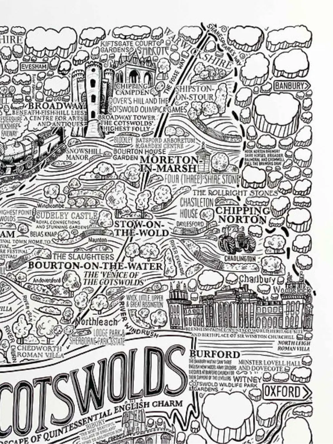 Explore this one-of-a-kind illustrated map of the Cotswolds, featuring standout landmarks and beloved locations such as Blenheim Palace, Sudeley Castle & Gardens, Cotswold Wildlife Park & Gardens, Cirencester Park, Gloucester Cathedral, Batsford Arboretum, and Woodchester Park — along with many more iconic sites including Chedworth Roman Villa, Snowshill Manor, and Stow-on-the-Wold.