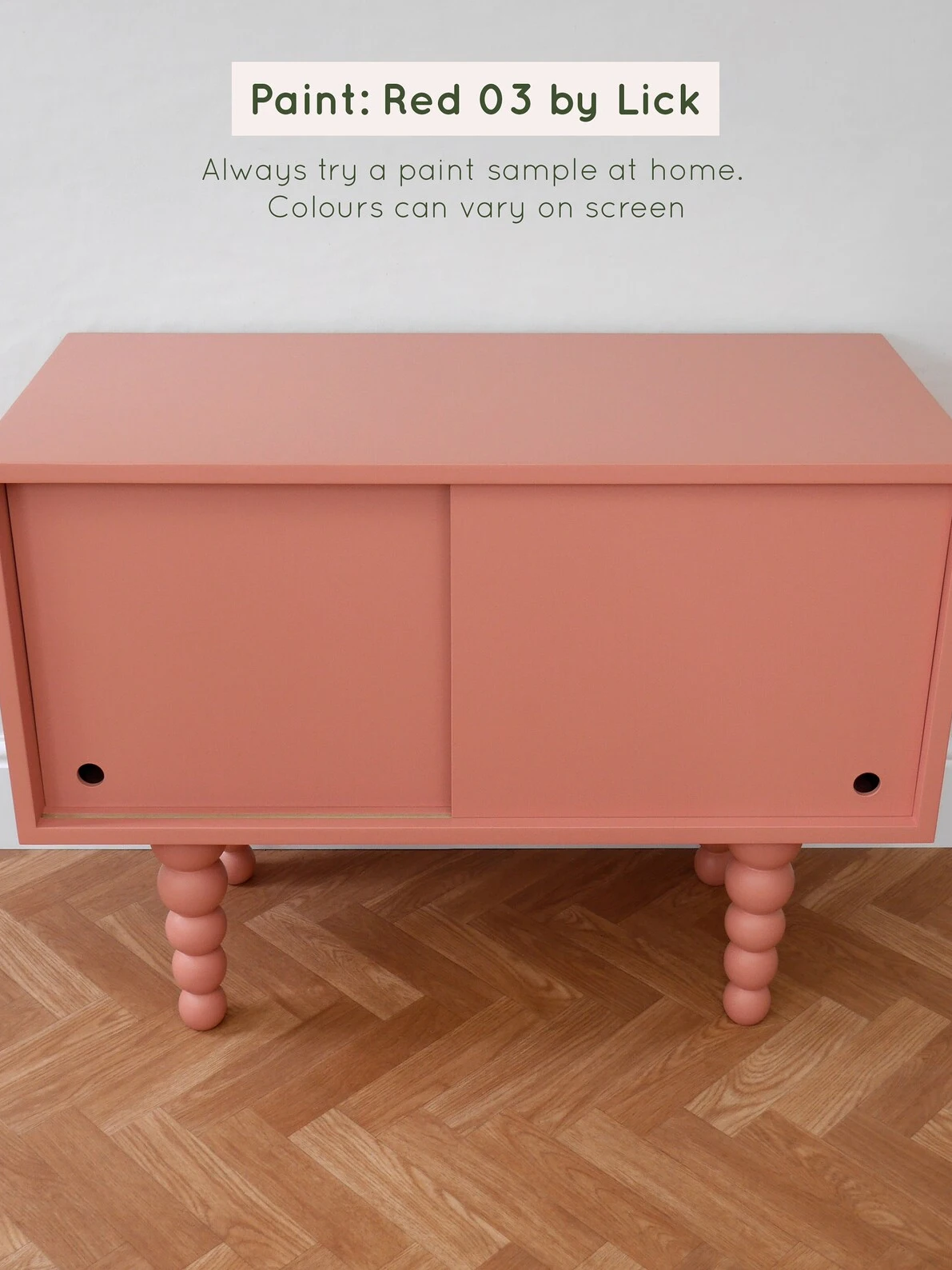 Handmade cabinet with bobbin legs, painted coral red. Ideal for use as a TV cabinet, record storage, drinks cabinet or toy cupboard.