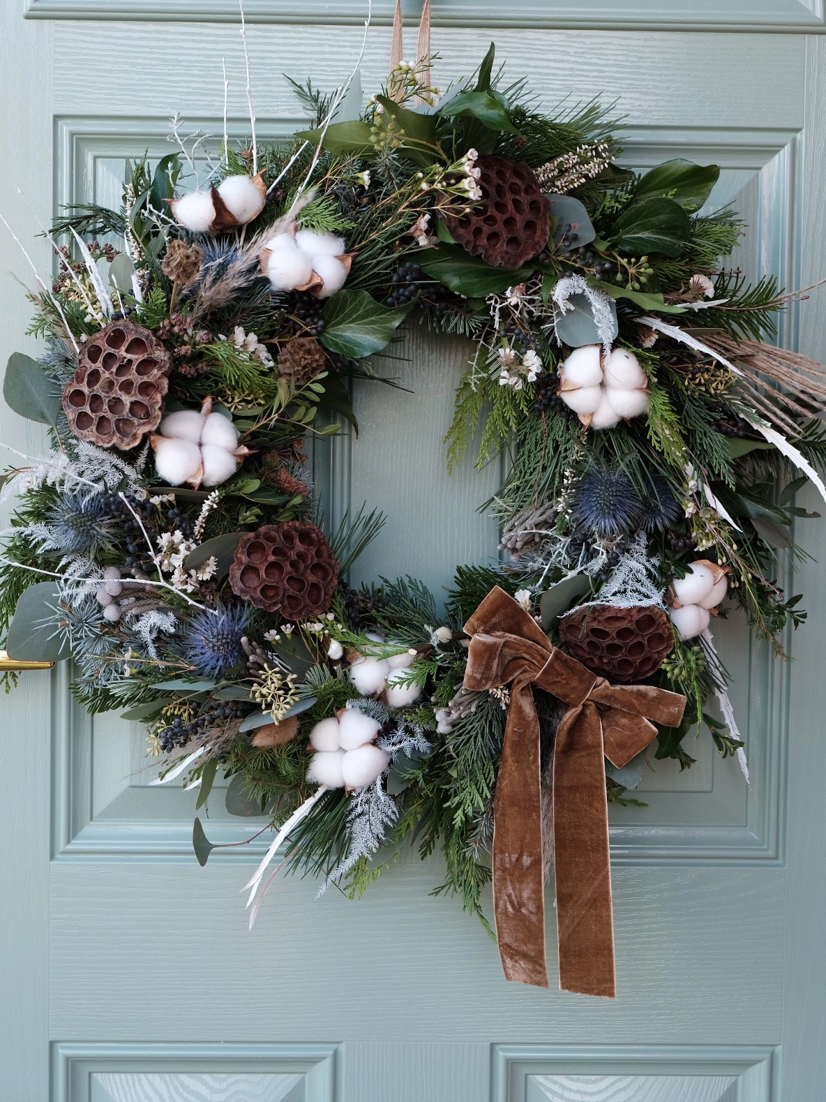 Our ‘Cotton Luxe’ Christmas wreath is the ultimate festive door design, sure to be the envy of all your neighbours! This stunner is packed with so many textures using a vast array of different foliage and dried florals, including featuring cotton and euca...
