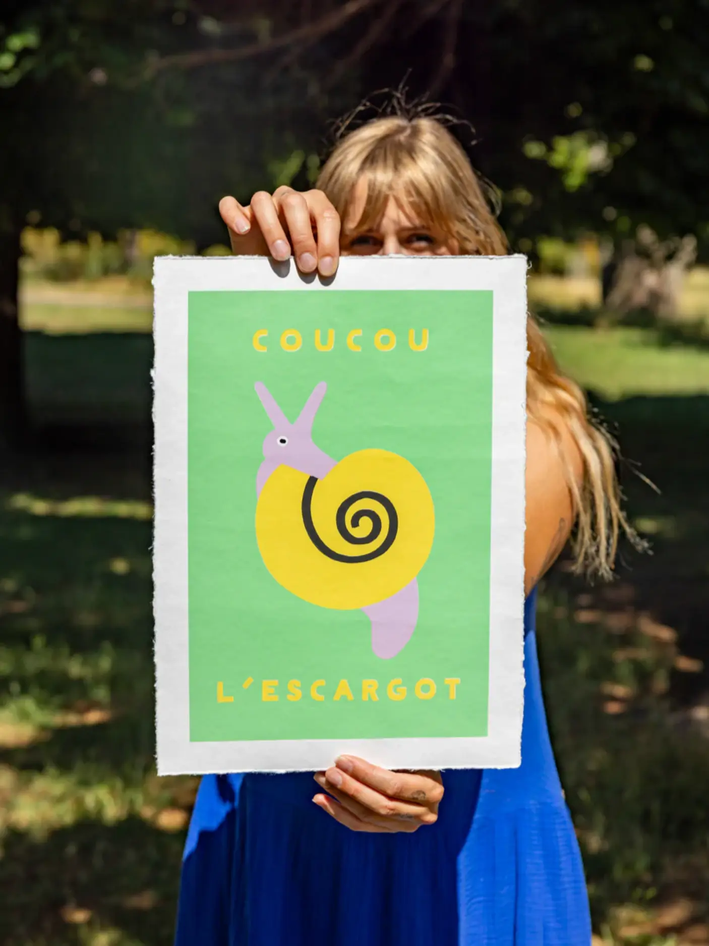 Say “hello” to a dash of whimsy with this cheerful A3 art print by Mélanie Johnsson, featuring a bright and friendly snail paired with the French greeting “CouCou L’Escargot.” Playful and modern, this artwork is perfect for children’s rooms, nurseries, or any corner that needs a little fun.