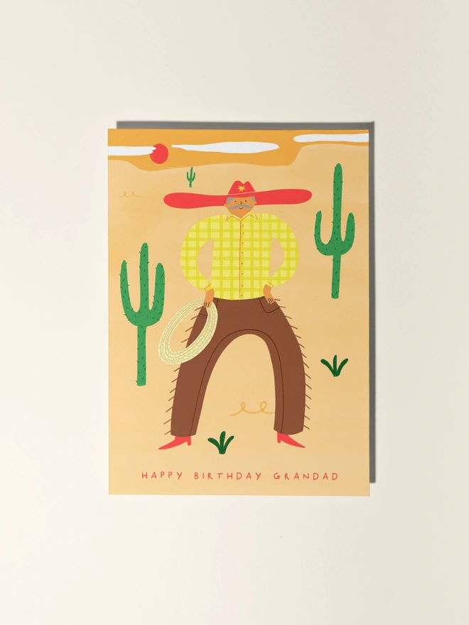 Birthday card for a cowboy loving Grandad. Featuring handwritten text 'Happy Birthday Grandad' and a happy cowboy in the desert...