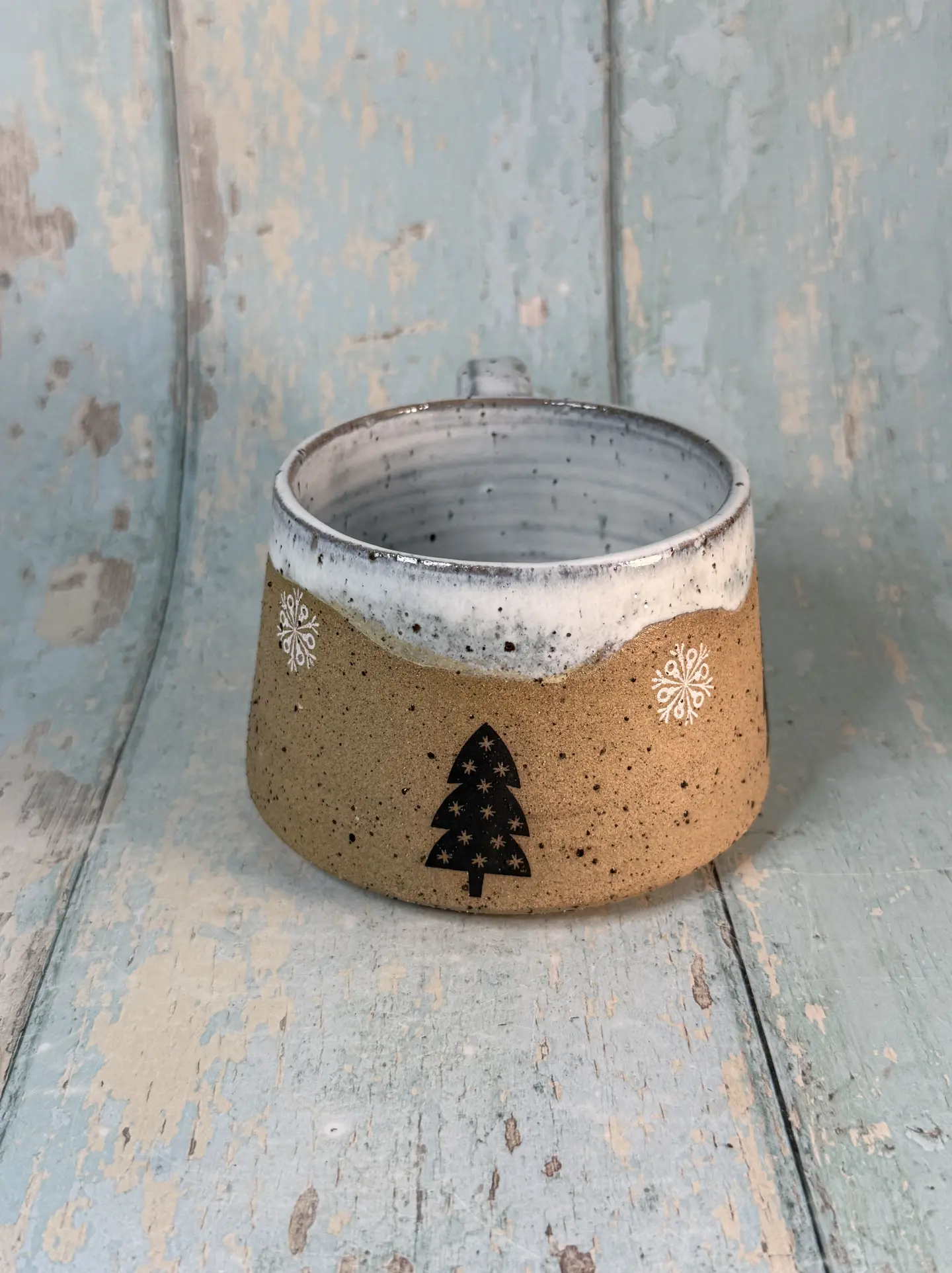 This unique ceramic cup features a stylised Christmas tree design in rich white glaze against a deep black forest backdrop, combining festive charm with elegant minimalism...