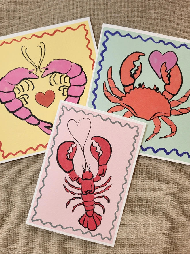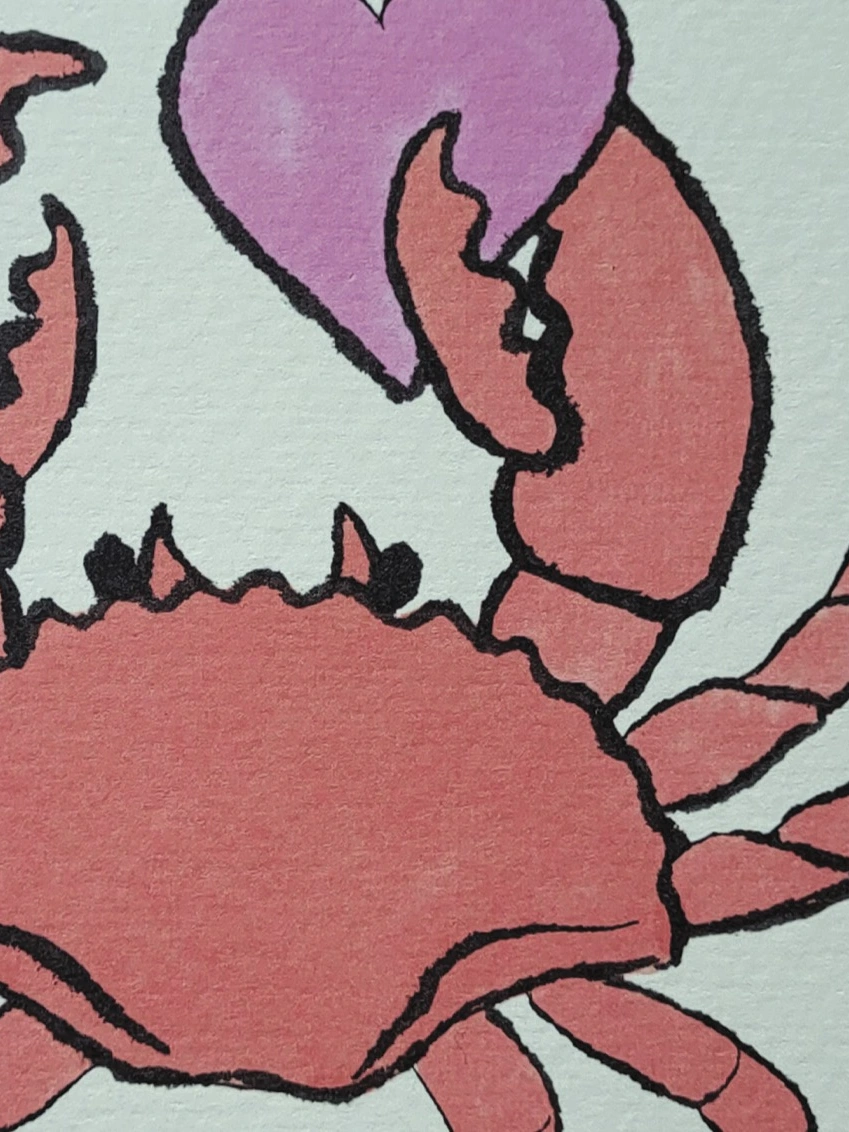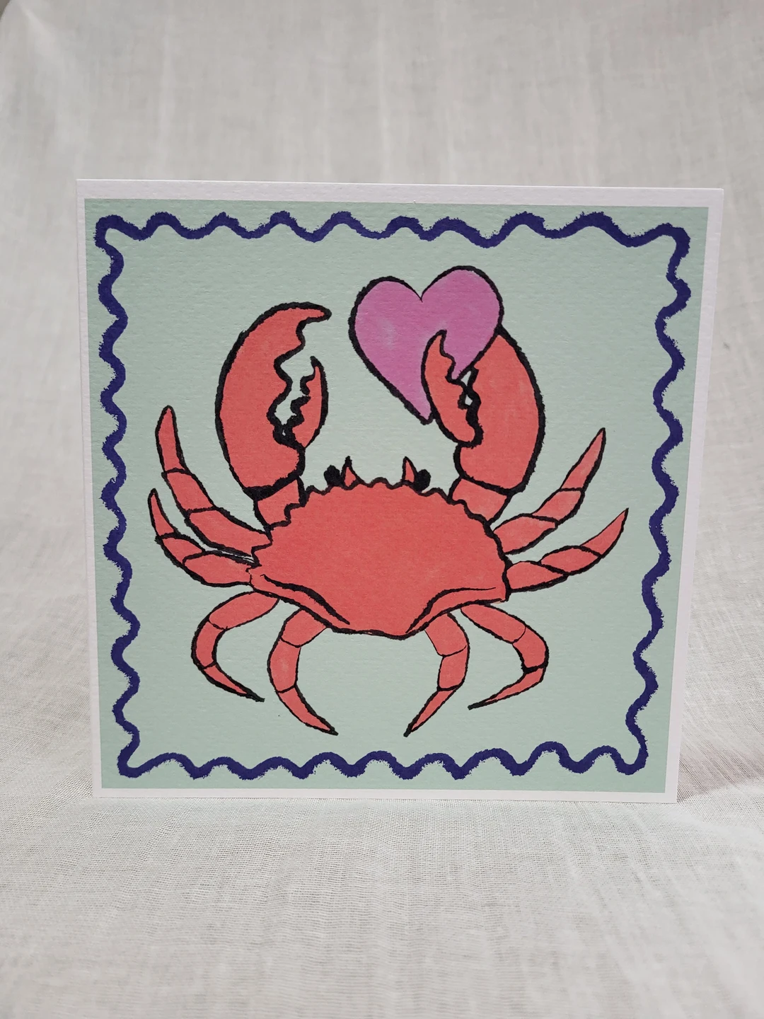 Printed greetings card with coral colour crab holding a pink heart on mint green background.