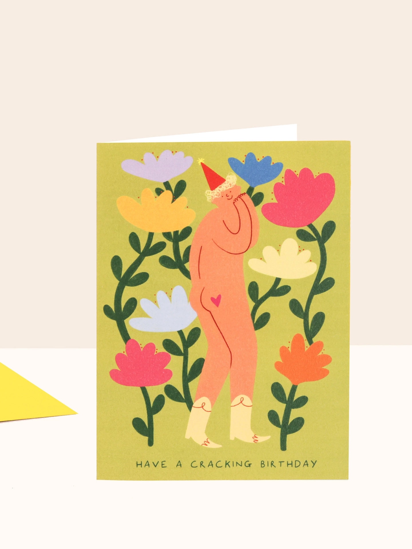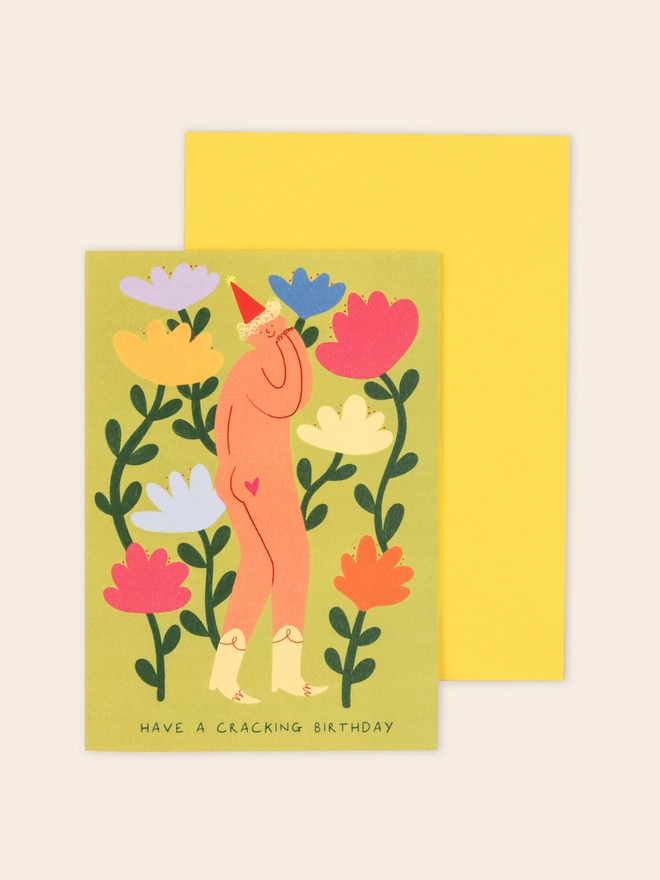 Silly birthday card featuring illustration of a cheeky figure wearing cowboy boots, a party hat and not much else! Surrounded by colourful flowers. Text reads 'Have a Cracking Birthday'.