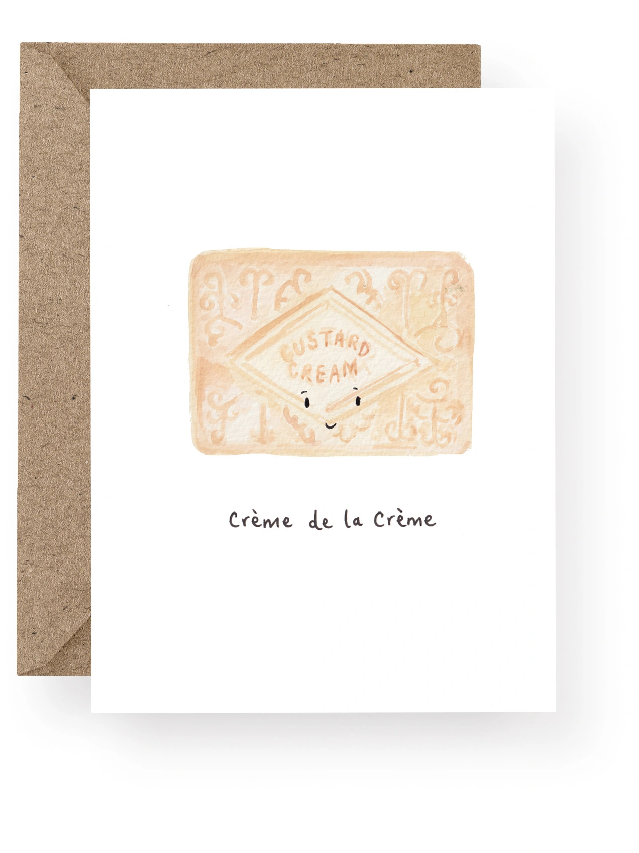 The Card reads 'Crème de la Crème' and features a watercolour illustration of a custard cream biscuit