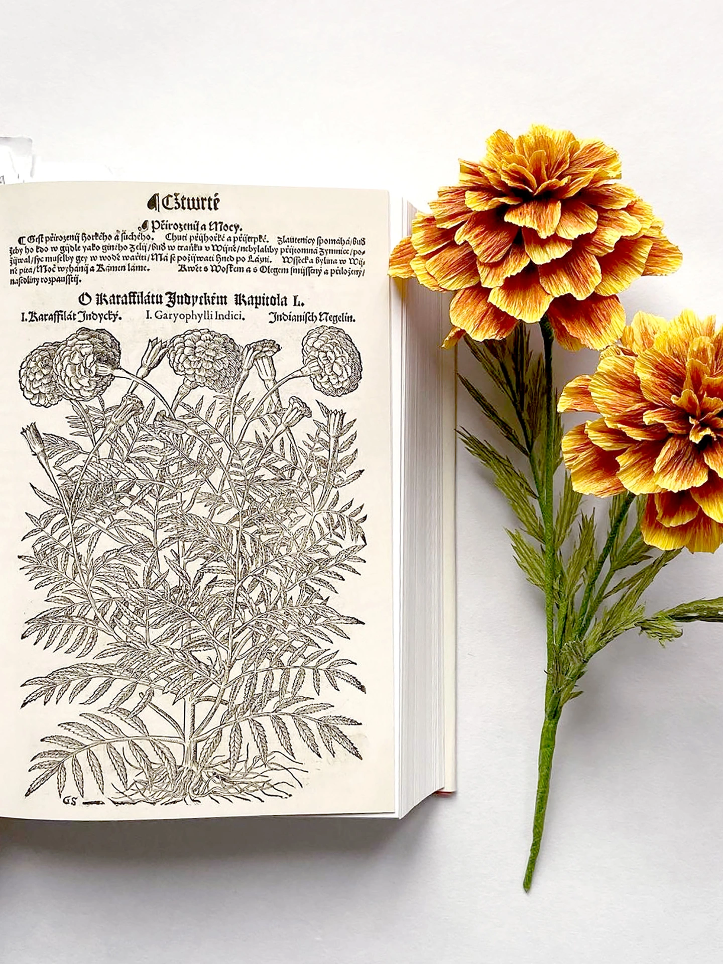 This French Marigold is inspired by a botanical illustration. It is a kit for you to make Crepe Paper French Marigold Flowers, you will able to make 2 big French Marigolds with 3 green leaves with the provided materials. If you don't understand the guidel...