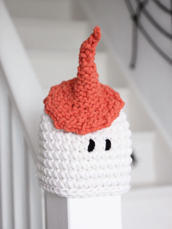 Add a playful handmade touch to your home this autumn with this crochet ghost banister topper - a cosy, friendly ghost designed to perch happily on your staircase, shelf edge, or mantel.