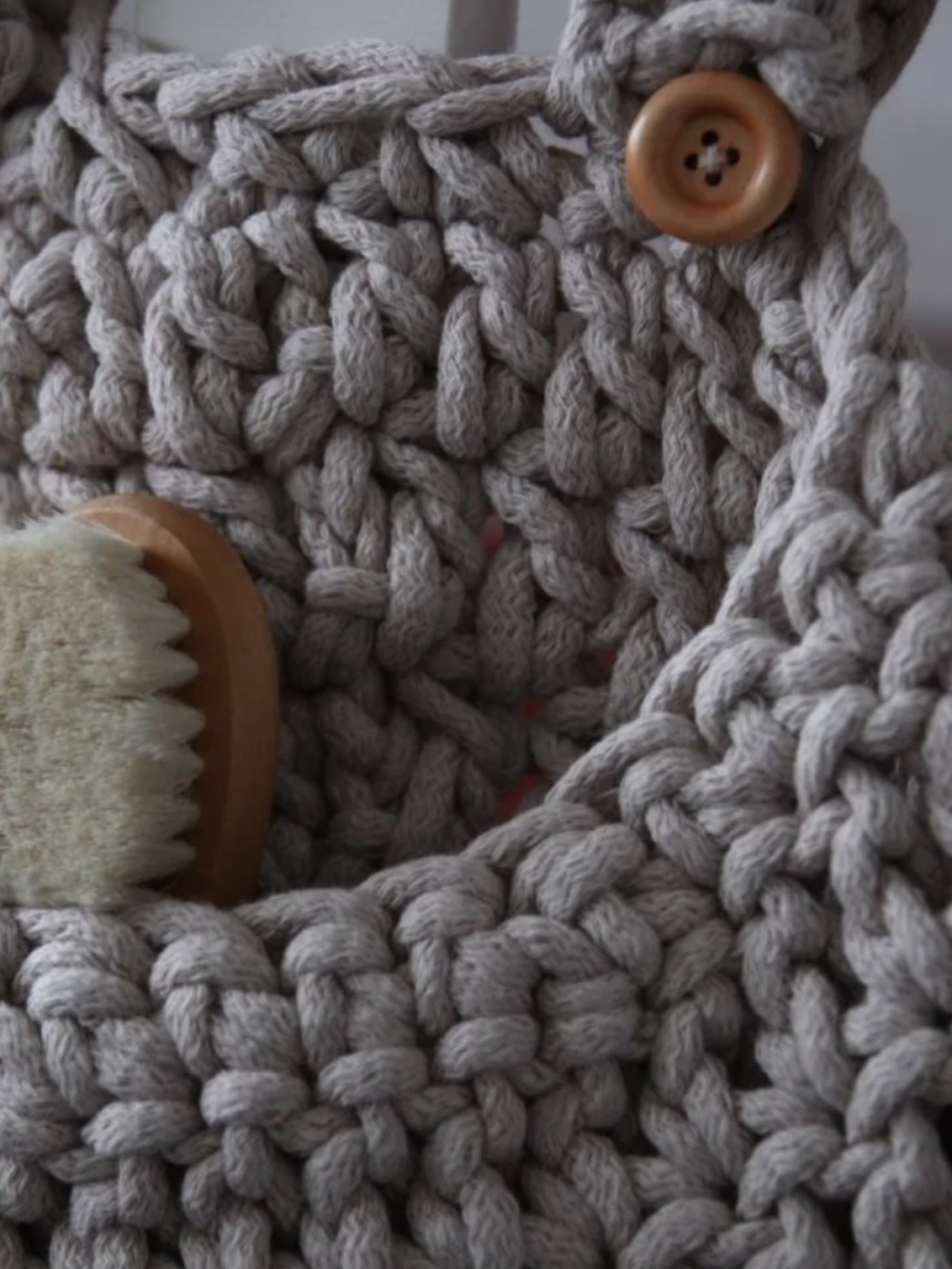 This hanging bag was carefully hand crocheted using eco-friendly 100% cotton cord.