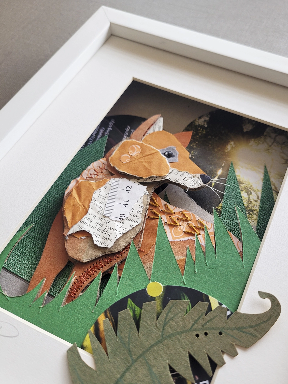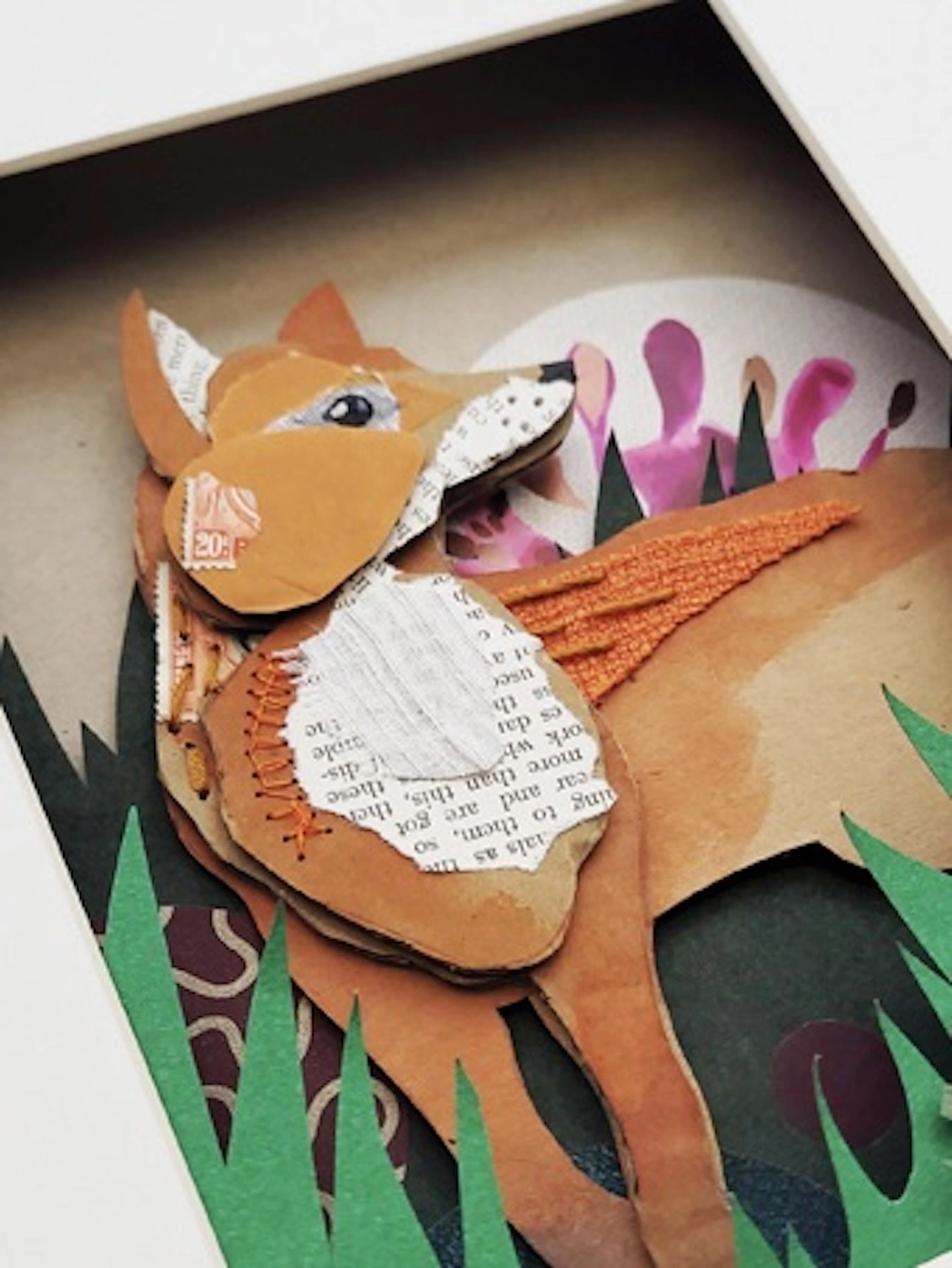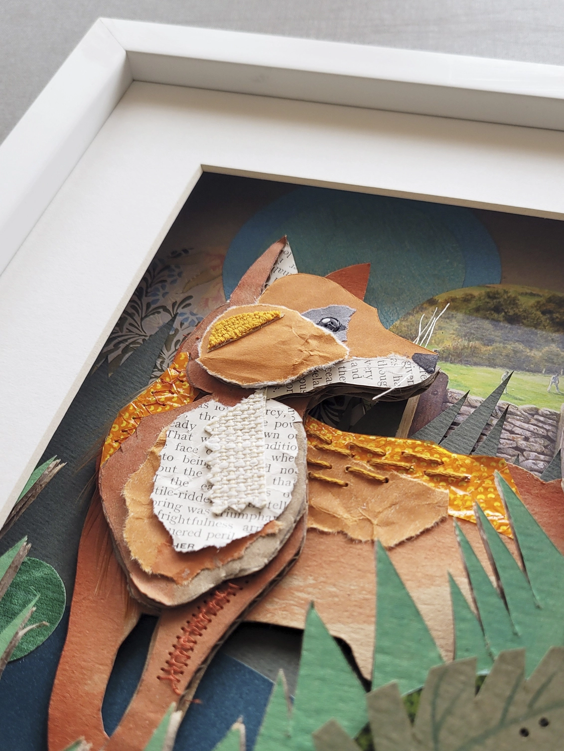 This cute box framed Fox is is created using a wide range of salvaged materials from salvaged tweed or vintage fabric scraps to old encyclopaedia pages. Primarily made from corrugated card he is embellished with paper and fabric collected from end of season sample books, recycled buttons, finished off with both machine and hand sewn highlights.