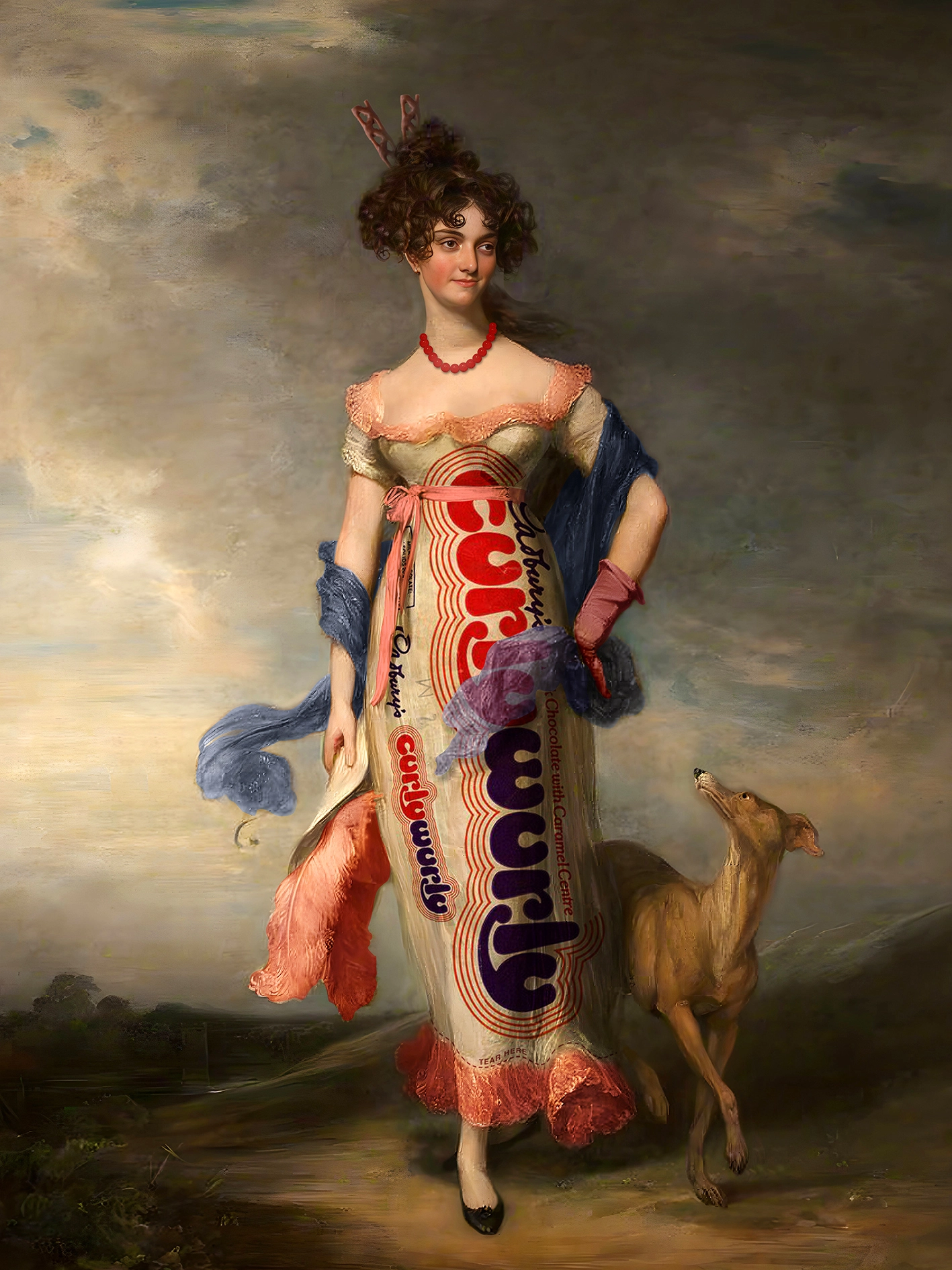 Part of a large ongoing series of works called The Product Placement Project. Humorous & fun Pop-Surrealist work exploring the connections and boundaries between art and advertising and a reflection on the functions of fashion & clothing