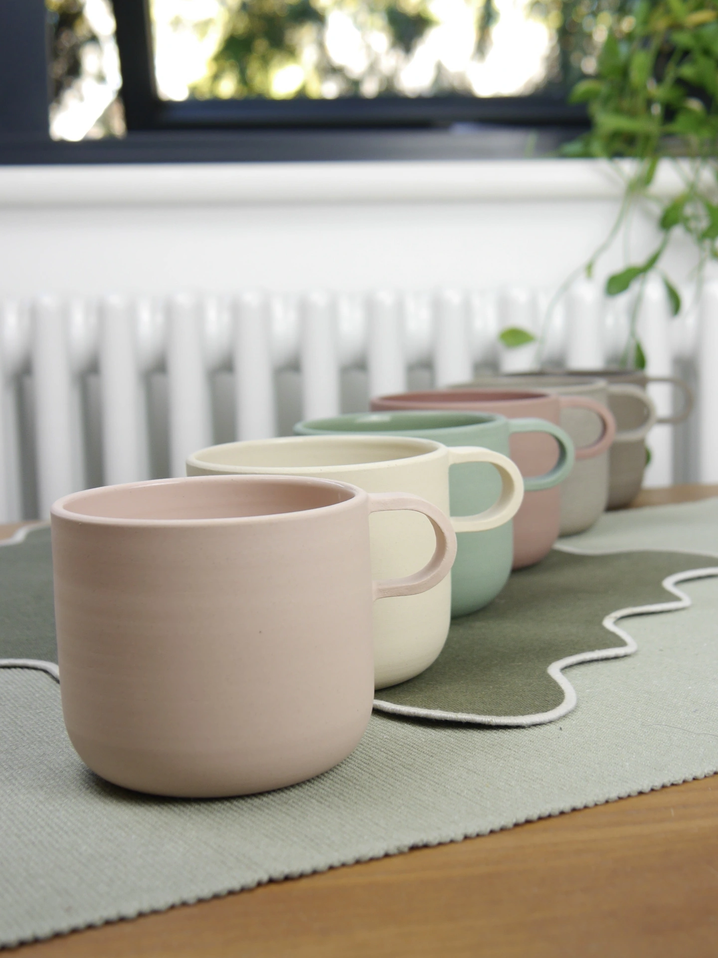We use stains to colour the clay before throwing with it on the wheel, meaning that the mug is pigmented throughout