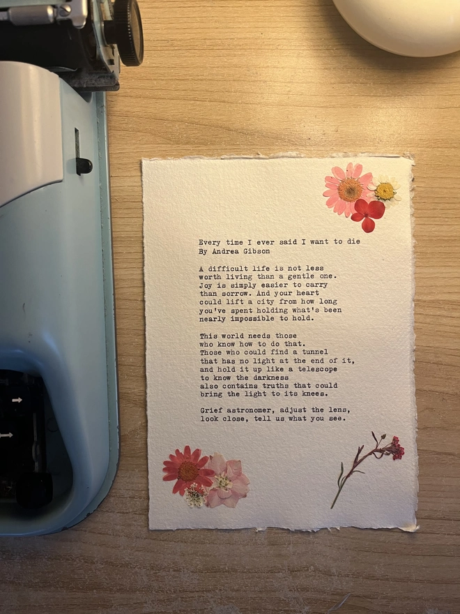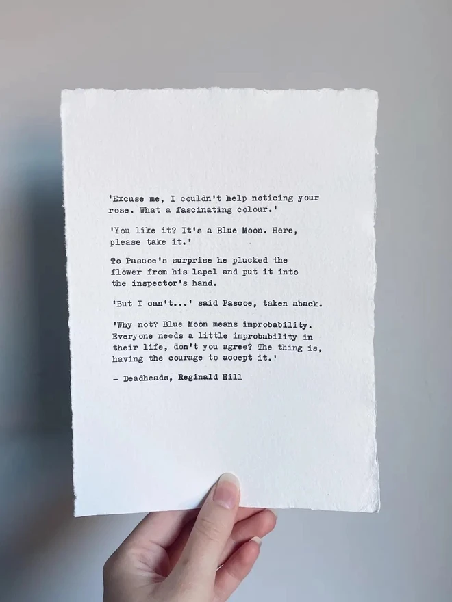 Each piece is hand typed on my 1930's Italian typewriter onto hand made white cotton rag. Send your quote, poem, phrase, song lyric, or original words by yourself and I’ll transform your chosen words into a one-of-a-kind, unique gift for a loved one suita...