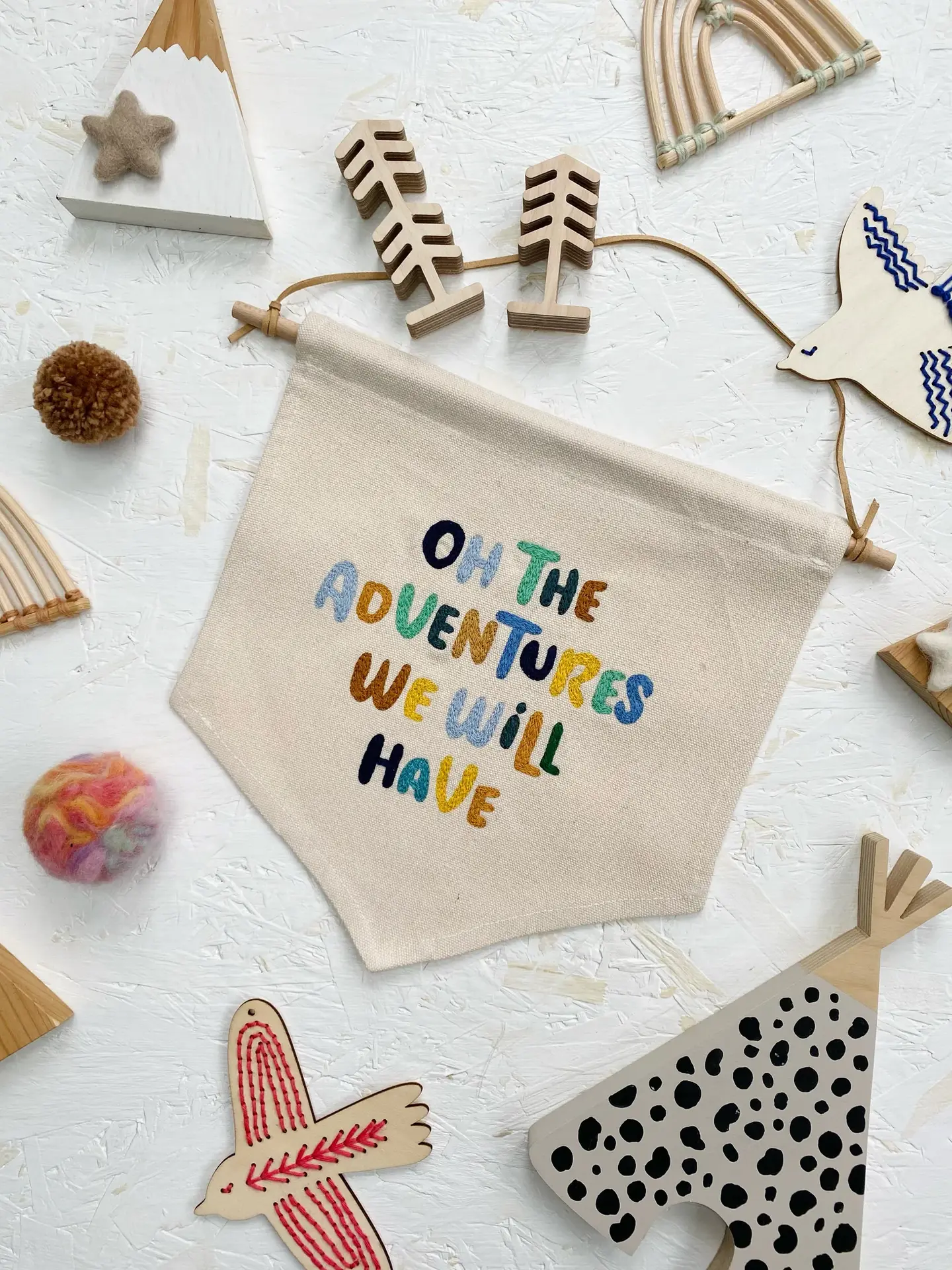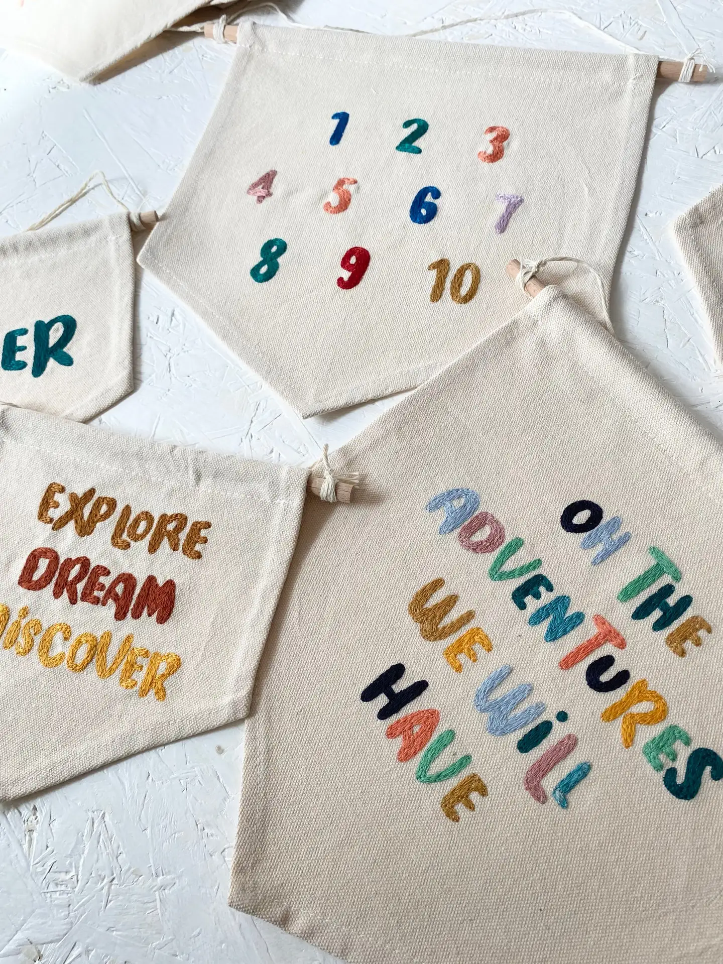 A free-hand machine embroidered banner, featuring typography custom coloured embroidery on a natural cotton calico banner.