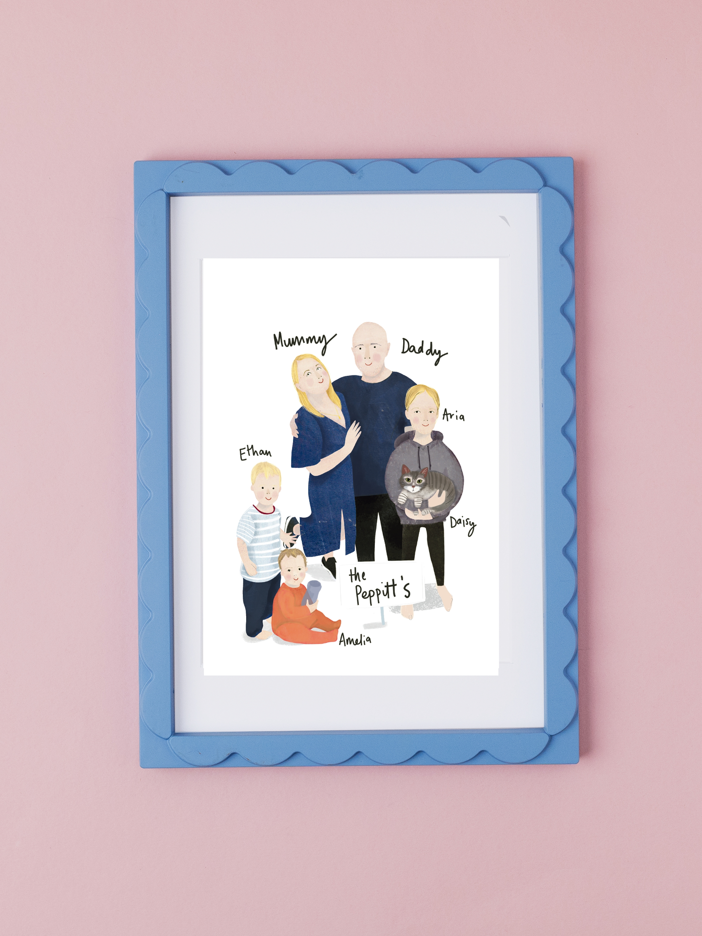 A custom family portrait. Your portrait is created using collage first and then digitally finished. Available in A3, A4 or A5.